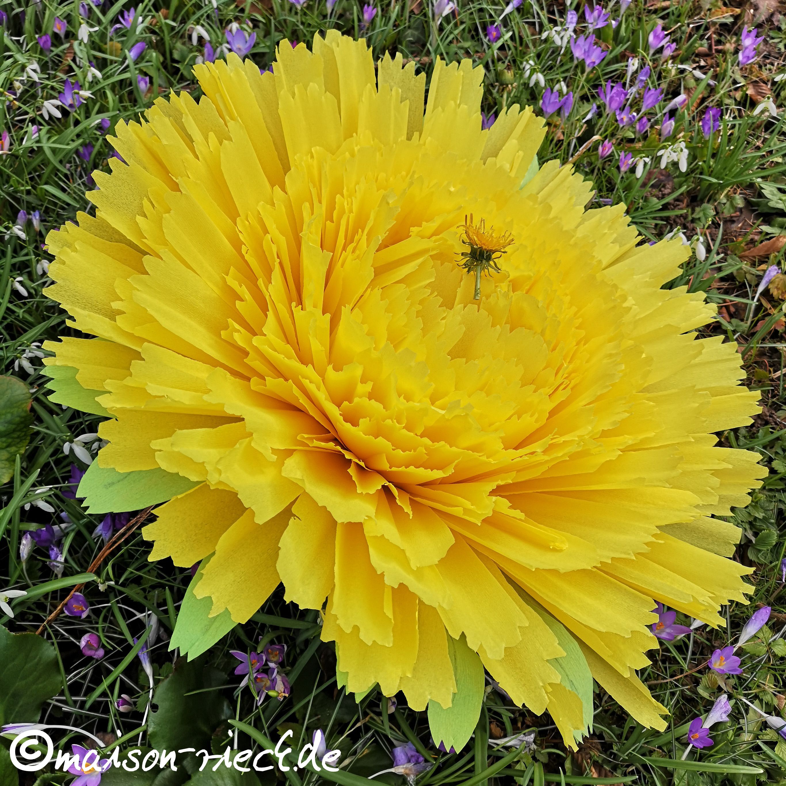 Hier nochmal eine echte und die nachgebaute Löwenzahnblüte im Vergleich. Im Bild recht ist am rechten Bildrand der Größenvergleich zwischen dem Vorbild und dem Kopfschmuck zu sehen.