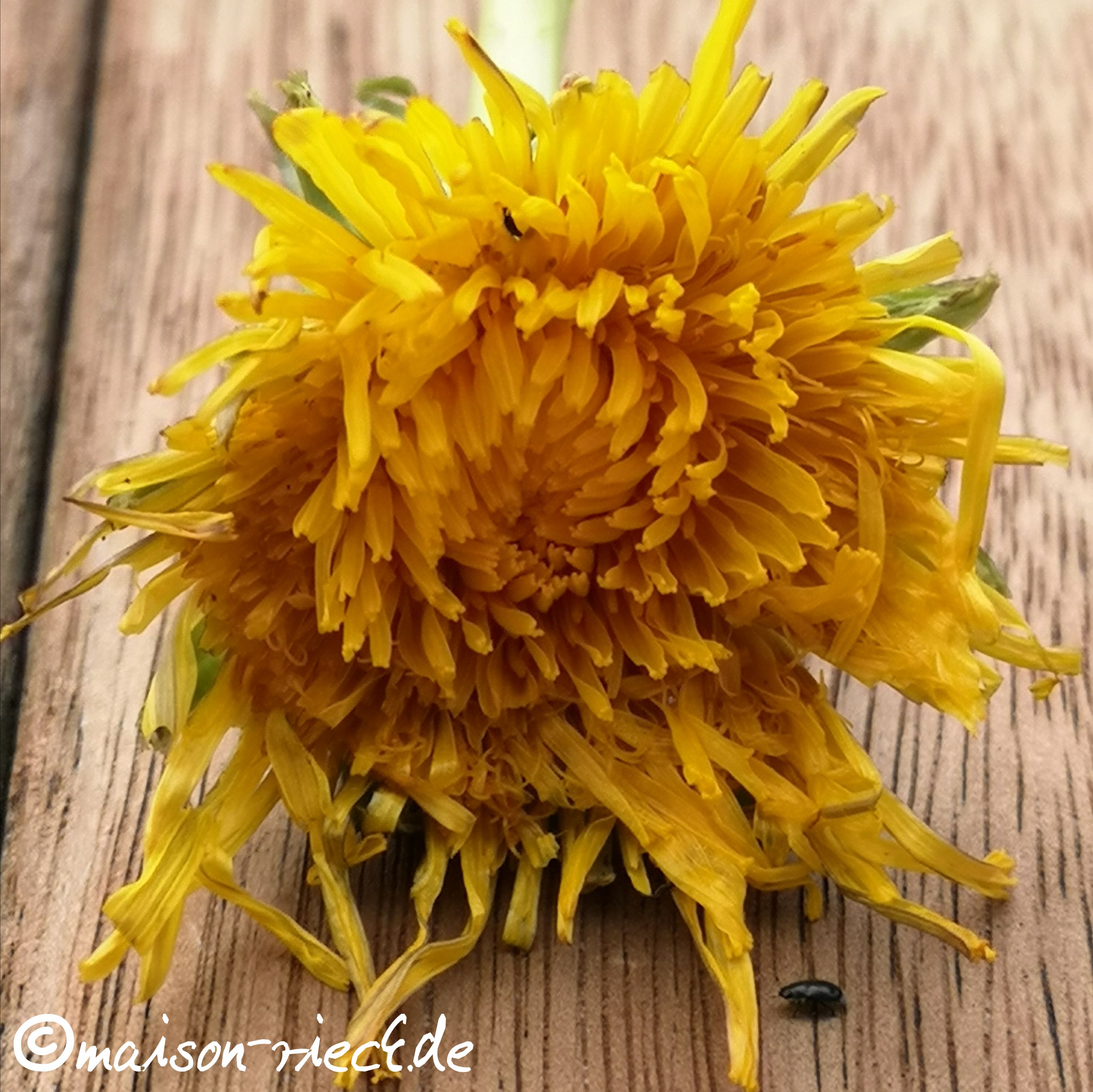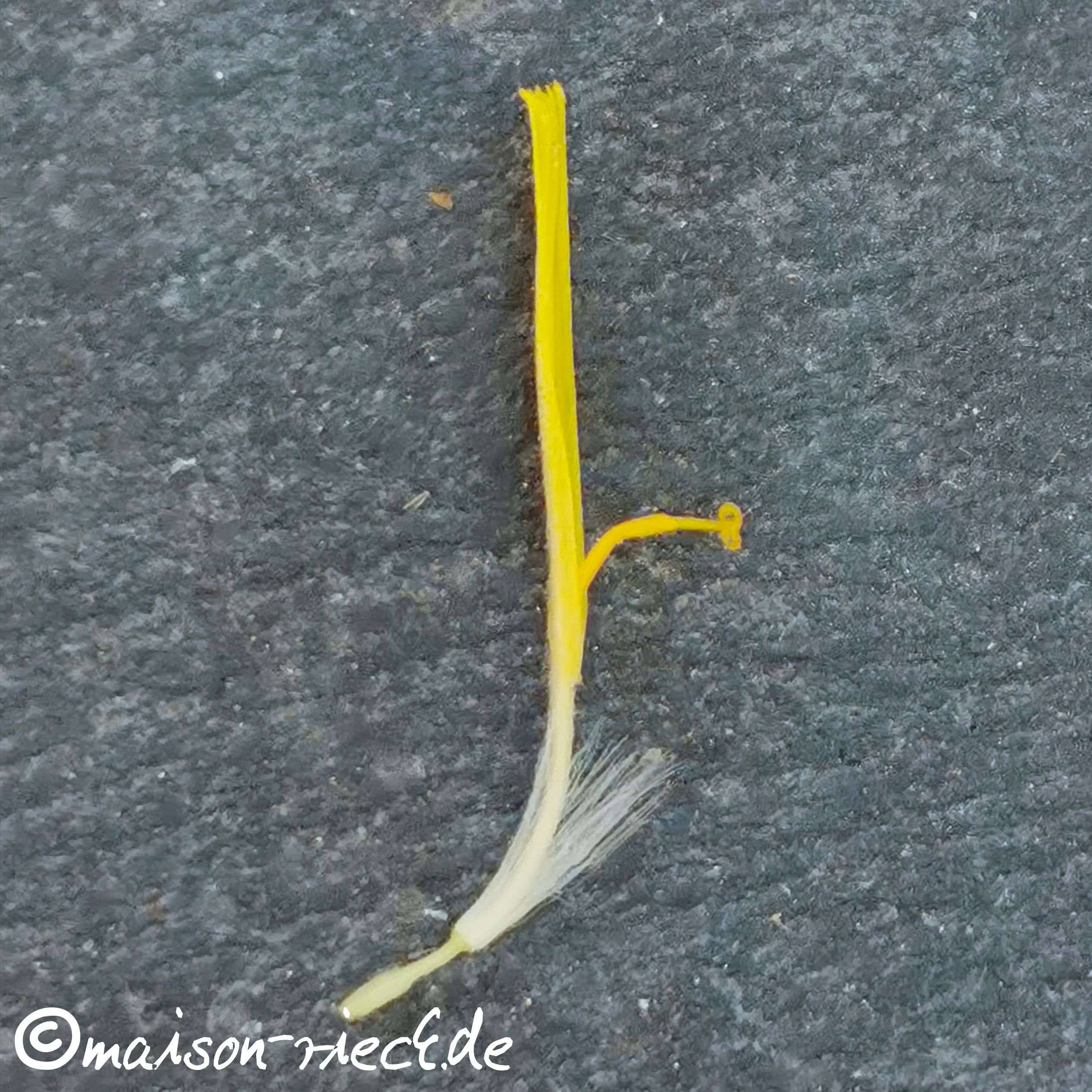 Alleine diese Verwandlung lohnt einen genaueren Blick. Die gelben Blütenstände sind gar keine richtige Blüten, sondern setzen sich aus sehr vielen einzelnen „Scheinblüten“ zusammen, sogenannten Zungenblüten. Diese sind an den Spitzen leicht gezähnt und an einer kapselartigen Basis zu einem tellerförmigen Körben zusammengefasst. In der Knospe sind die vielen Zungenblüten fest dicht gepackt.