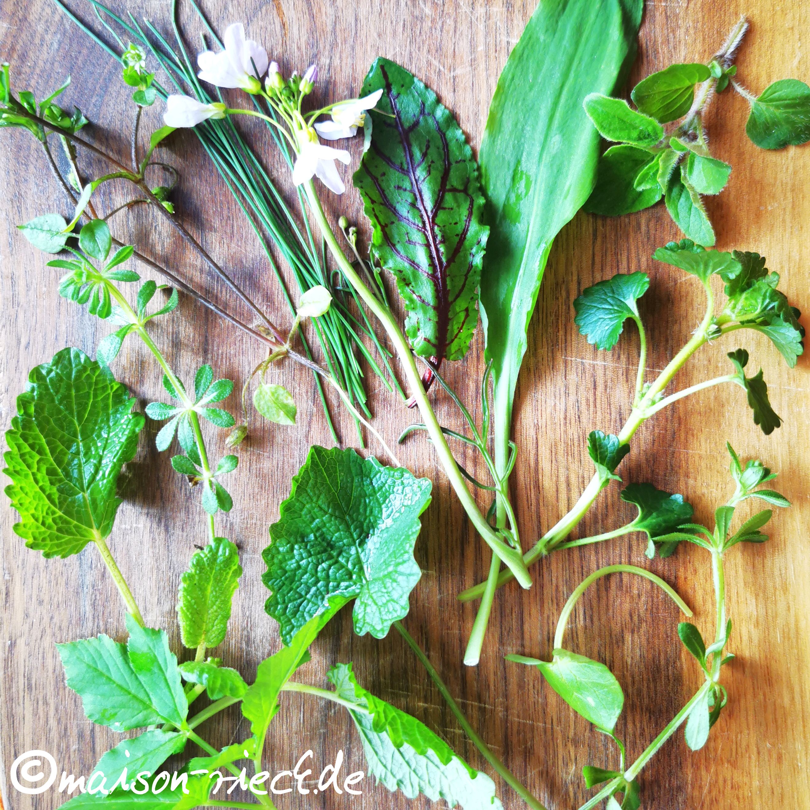 Als bei uns „heimische“ Petersilie gelten sowohl Giersch als auch Gundermann. Beide Wildkräuter sind sehr aromatisch, Giersch schmeckt nach Sellerie/Möhre, Gundermann dagegen hat einen erdig-frischen Geschmack. Beide sind im Frühjahr reichlich vorhanden und dienen als Basis. Sauerampfer liefert Säure, die beiden Schaumkräuter und der Weinbergschnittlauch Schärfe, die Zitronenmelisse zitronige Frische, die Vogelmiere eine leichte Süße, der Löwenzahn und Schafgarbe eine bittere Note, Knoblauchrauke und Bärlauch den Knoblauch-Geschmack, Scharbockskraut und Labkraut grüne Blattmasse und letztendlich der Dost den typischen Oregano-Geschmack.