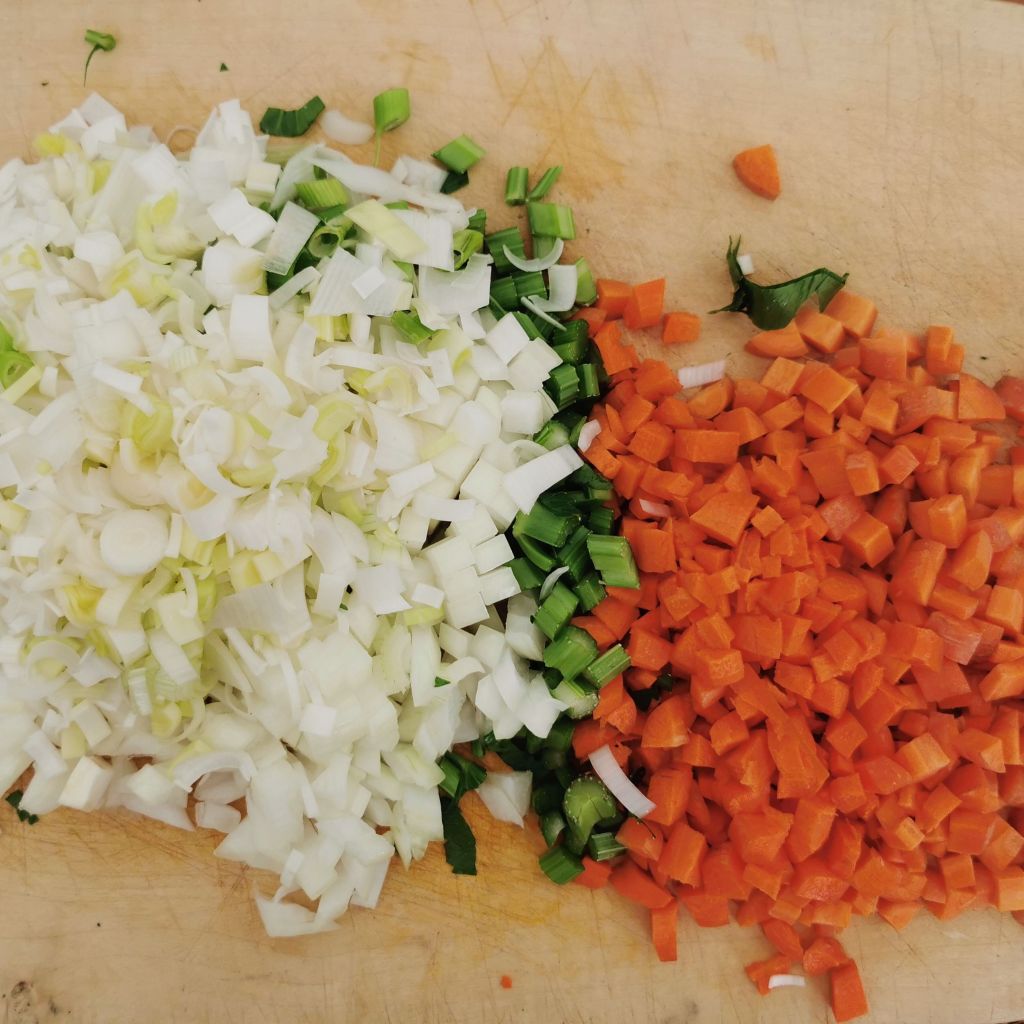 Mit den Linsen ebenso verfahren. In der Zwischenzeit die Zwiebeln und Möhren schälen und fein würfeln. Die Lauchstange längs halbieren und gründlich waschen, dann ebenfalls in Würfel schneiden.