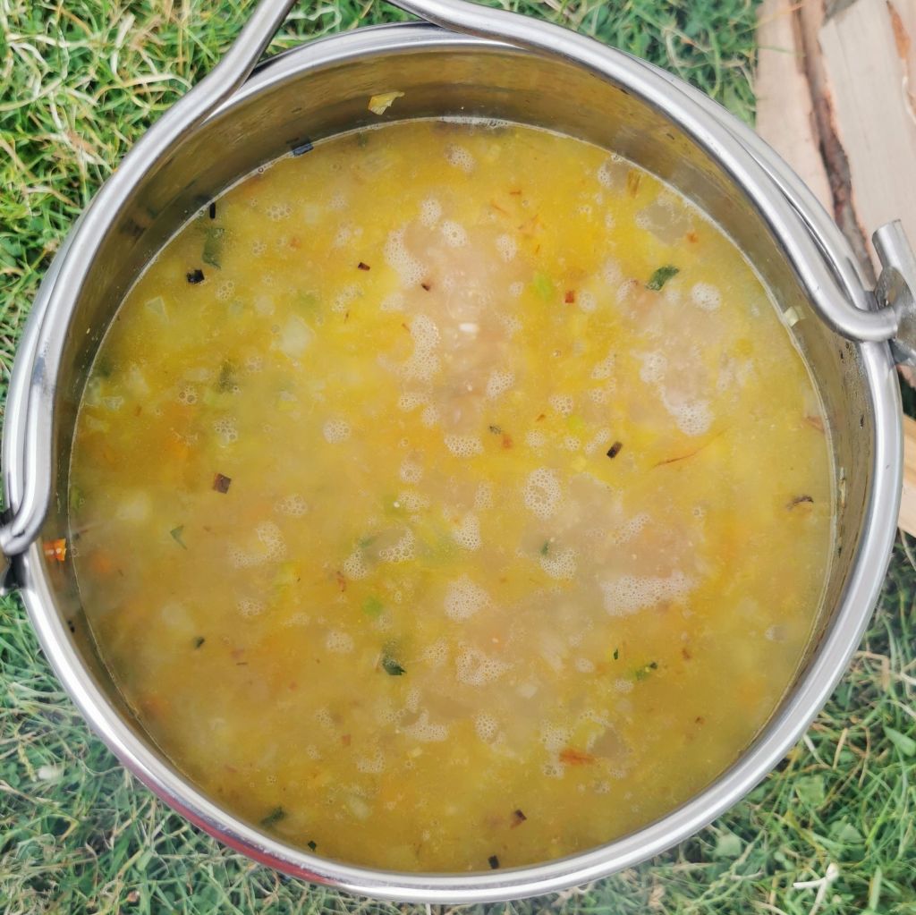 Dann kann das Feuer in der Kochstelle entzündet werden. Wenn das Feuer eine gleichmäßige, moderate Hitze liefert, einen großen Topf (mindestens 5 Liter) daraufstellen oder an einem Dreibein aufhängen. Das Öl (oder Butterschmalz hineingeben und die Zwiebelwürfel dazu. Wenn die Zwiebeln leicht angedünstet sind, die Möhren und die Lauchstücke dazugeben und unter Rühren dünsten, bis sie leicht bräunen (siehe Bild oben)