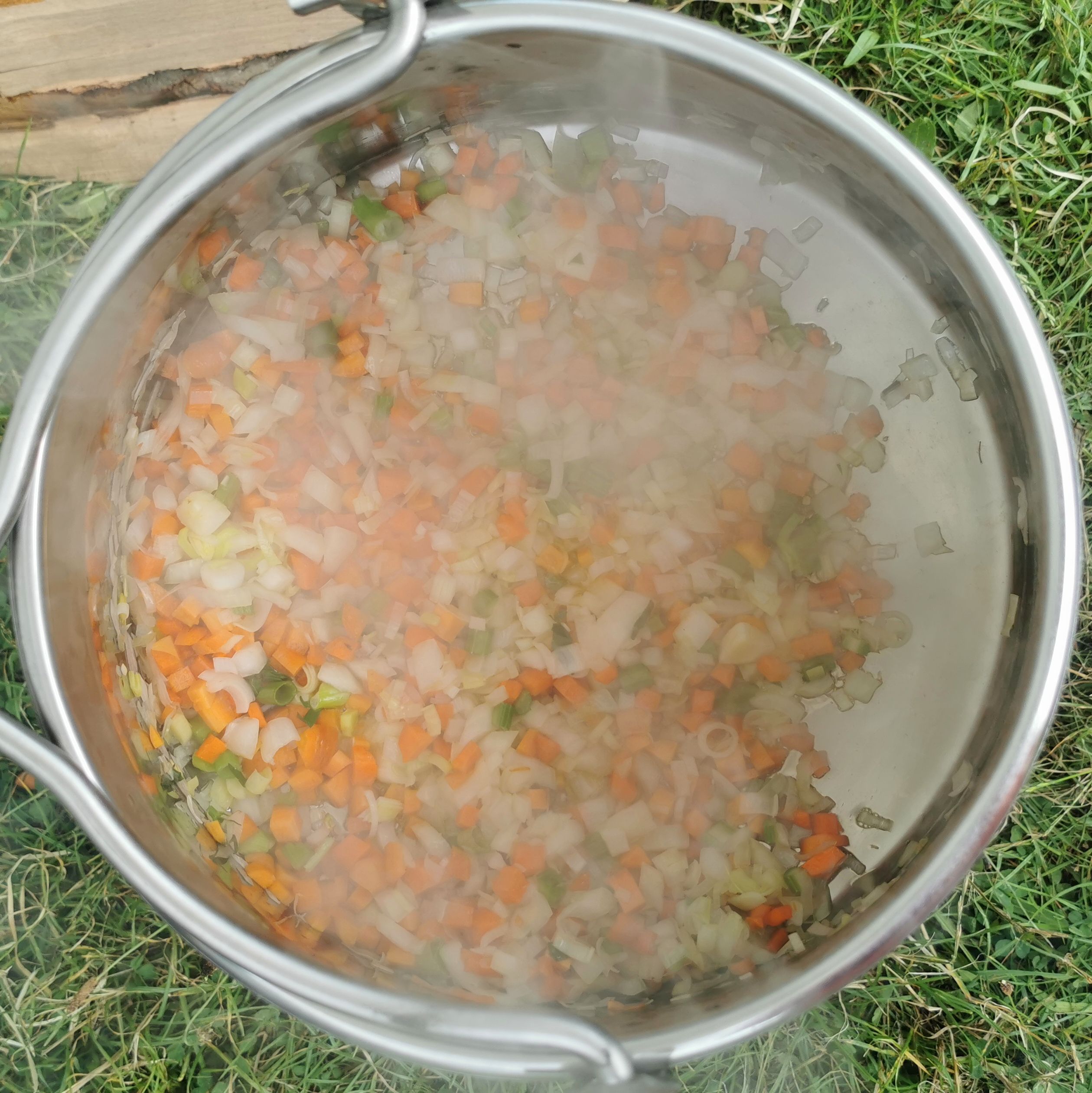 Dann kann das Feuer in der Kochstelle entzündet werden. Wenn das Feuer eine gleichmäßige, moderate Hitze liefert, einen großen Topf (mindestens 5 Liter) daraufstellen oder an einem Dreibein aufhängen. Das Öl (oder Butterschmalz hineingeben und die Zwiebelwürfel dazu. Wenn die Zwiebeln leicht angedünstet sind, die Möhren und die Lauchstücke dazugeben und unter Rühren dünsten, bis sie leicht bräunen (siehe Bild oben)