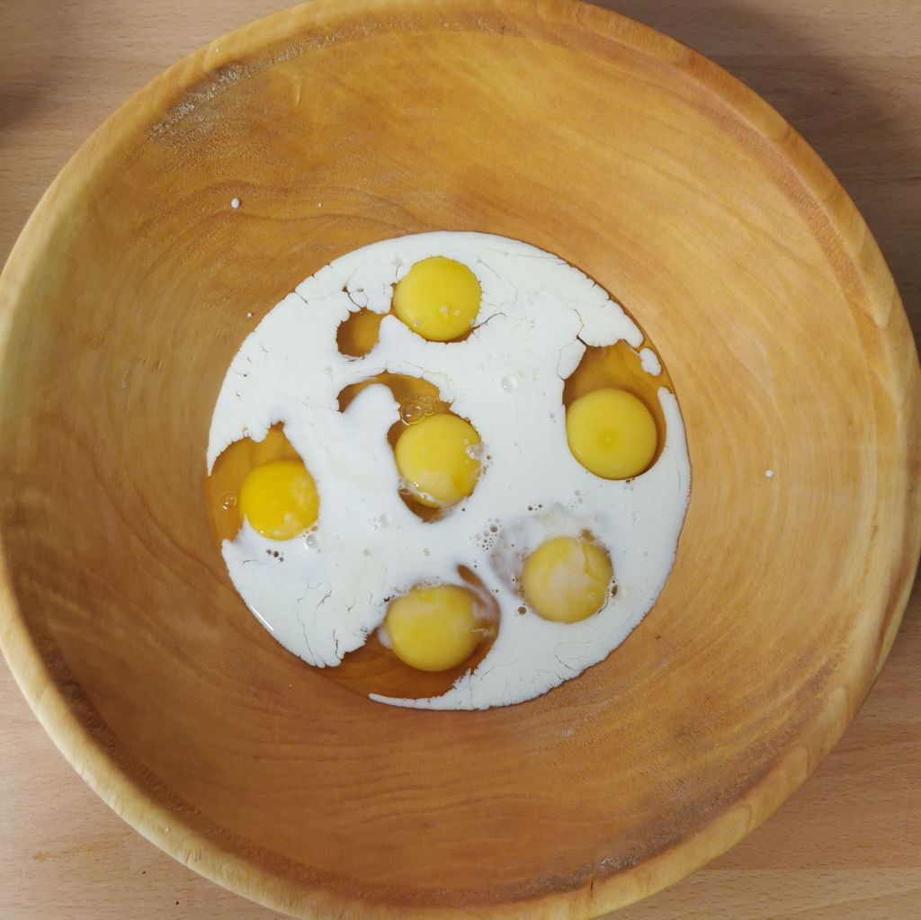 Die Eier in eine Schüssel aufschlagen und mit ca. 1/4 l Milch in verquirlen. Die Eiermilch mit ca. 1/2 TL Salz und frisch gemahlenem schwarzen Pfeffer würzen. Dann die getrockneten Brötchen- oder Brotstücke dazugeben und alles vermengen. Die Masse eine Weile stehen lassen, bis das Brot die Flüssigkeit aufgesogen hat. Je nachdem wie trocken das Brot ist, muss nach und nach noch mehr Milch dazugegeben werden. Die Masse so lange einweichen, bis das Brot weich ist, aber keine Flüssigkeit vorhanden ist. Der „Teig“ sollte sich auf jeden Fall noch formen lassen.