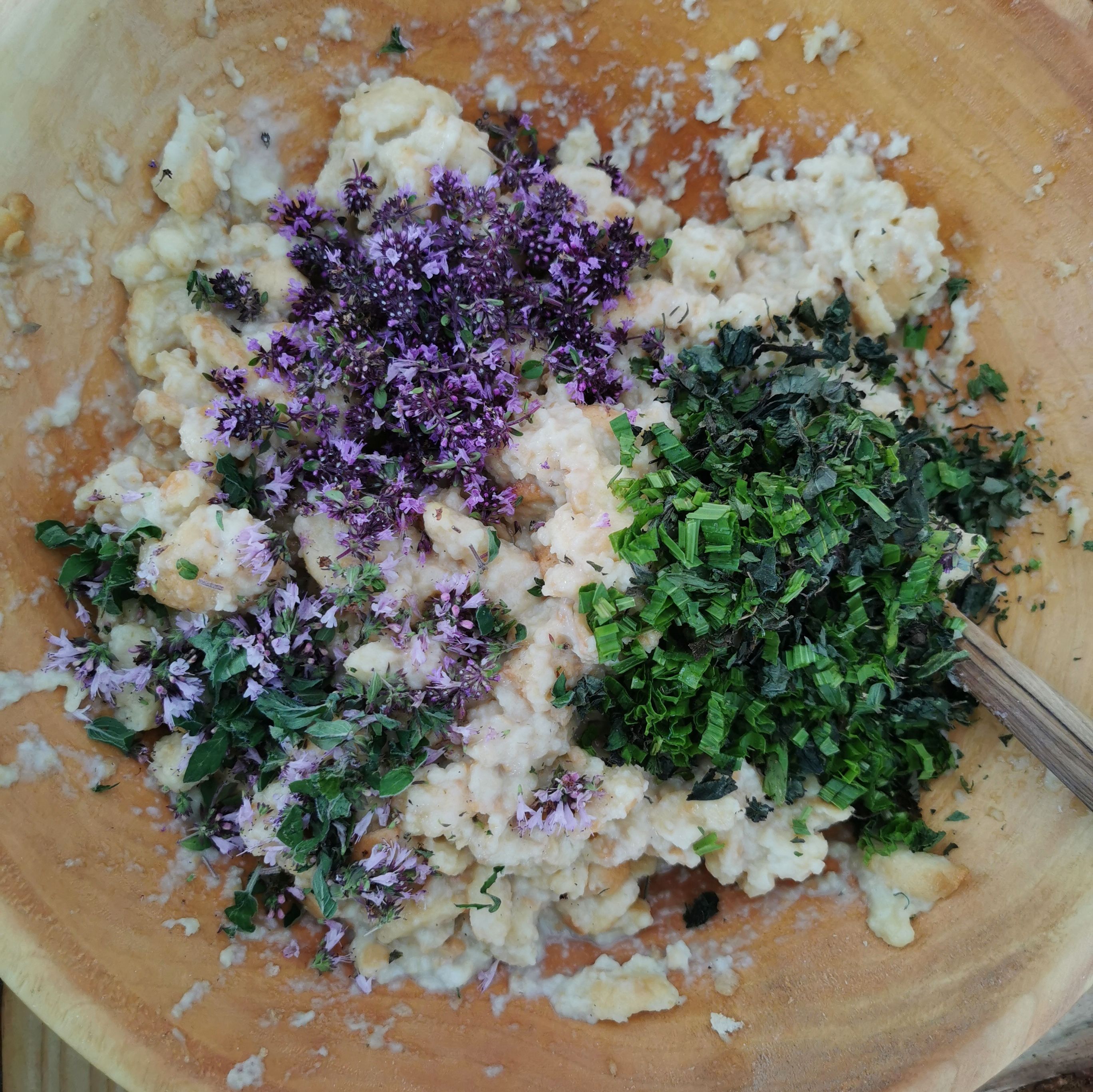Natürlich kann man den Knödel ganz und gar ohne Kräuter herstellen, oder aber zur Verfeinerung auf Gartenkräuter wie Petersilie und Schnittlauch zurückgreifen. Die besondere Note erhält man allerdings mit Wildkräutern der Saison. Im Sommer sind dies zum Beispiel: