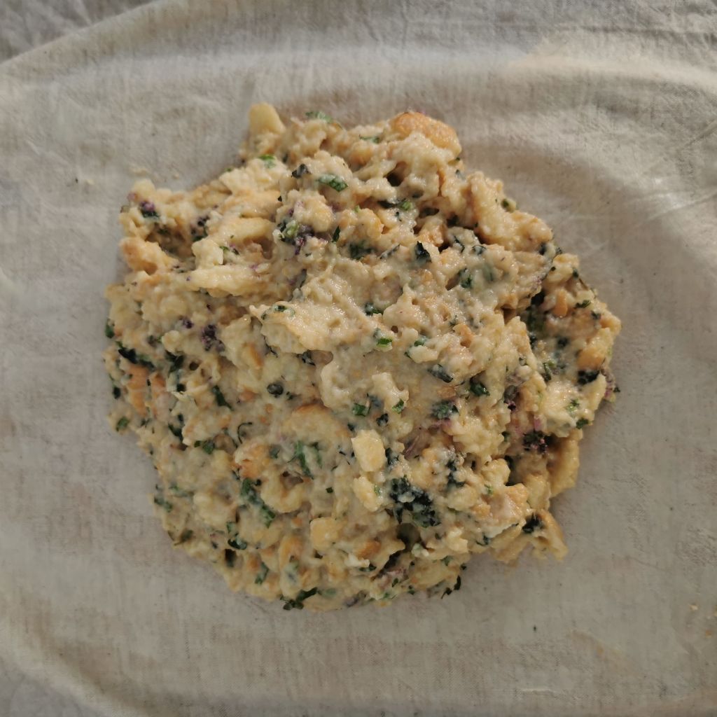 Das saubere Tuch gründlich unter fließendem Wasser auswaschen (um eventuelle Waschmittelreste zu entfernen), dann gut auswringen und auf der Arbeitsfläche ausbreiten. Mit einem Stück Butter das Tuch in der Mitte einreiben, damit der Kloß sich später auf jeden Fall löst. Die Brotmasse in der Mitte als „Berg“ hineinsetzen und das Tuch anschließend von allen Seiten anheben und über dem „Berg“ mit einem Bindfaden zusammenbinden. Dabei sollte noch etwas Luft im Tuch bleiben, da der Kloß beim Garen aufgeht.