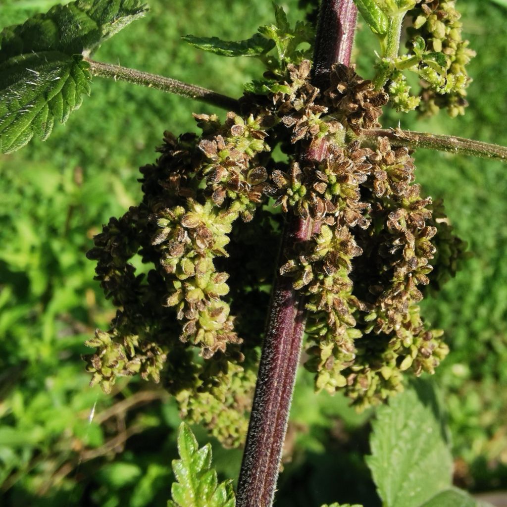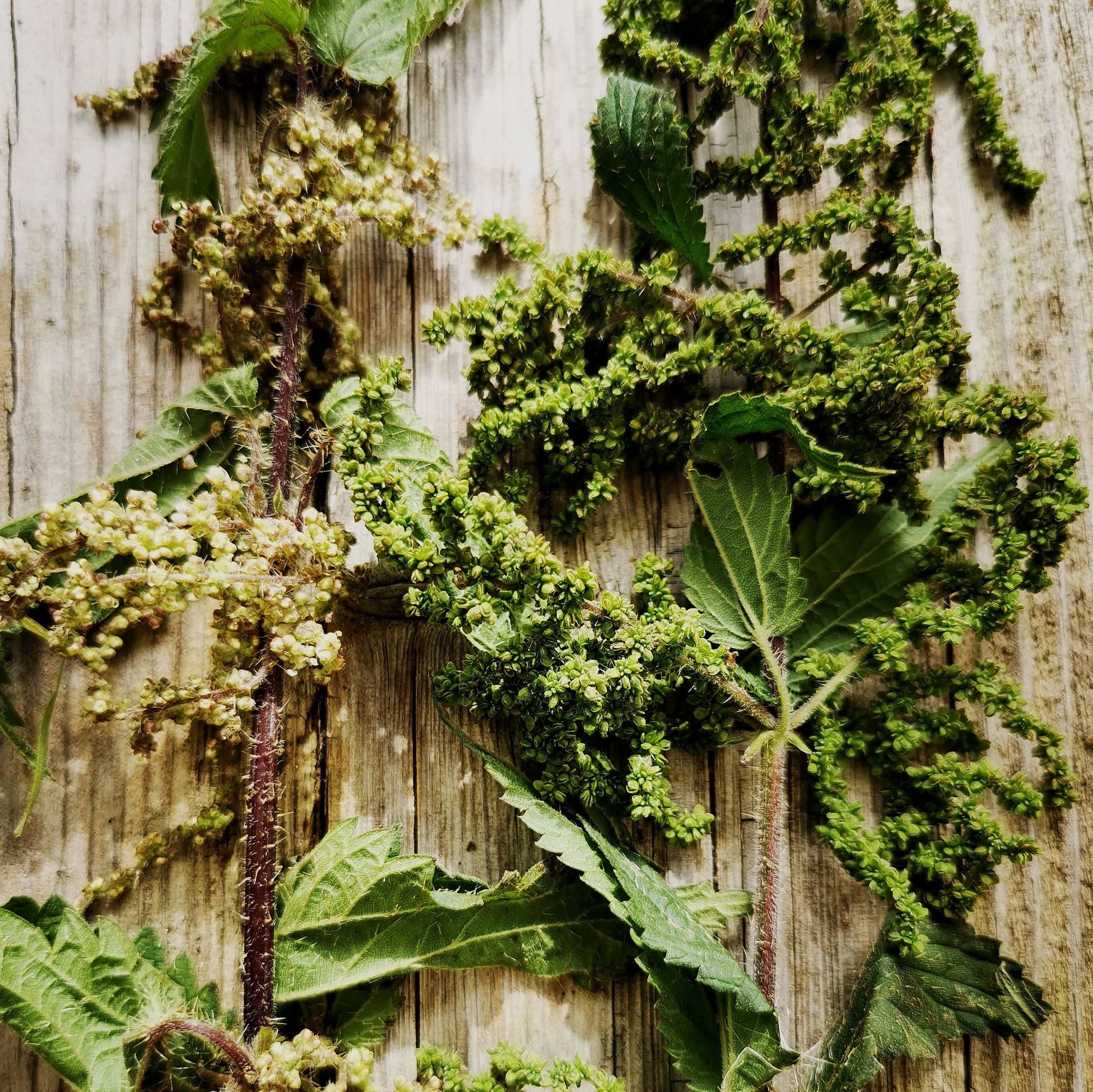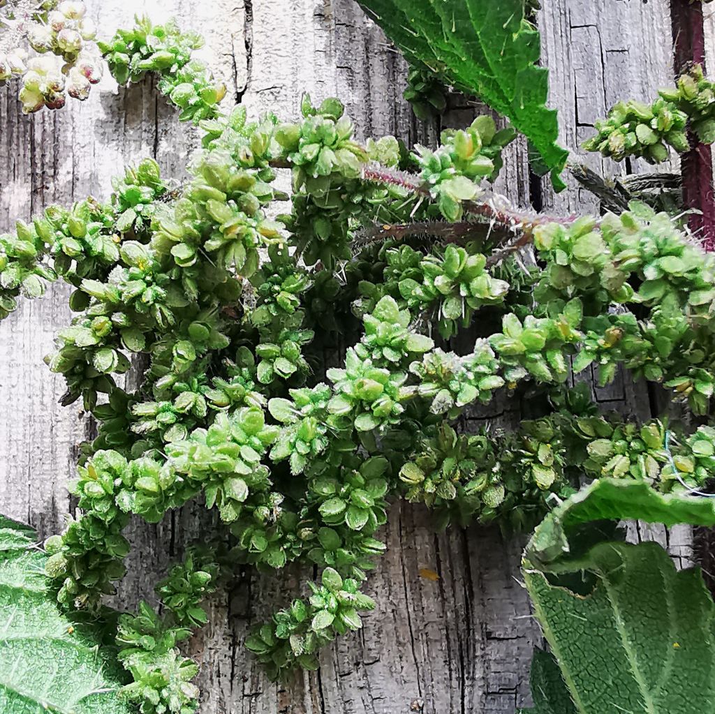 Außerdem ist es gut zu wissen, dass es männliche und weibliche Brennnesselpflanzen gibt. Während die weiblichen blühen und Samen bilden, verbreiten die männlichen Pollen. Die Pollenstände sehen auf den ersten Blick fast aus wie Samen, sie sind jedoch rund, deutlich gelblicher in der Farbe und sie stehen eher ab (im linken Bild auf der linken Seite zu sehen). Die weiblichen Samen haben dagegen eine flache, elliptische Formund hängen in Rispen herunter. Wenn man männliche statt weiblicher Pflanzenteile isst, ist das allerdings nicht schlimm; die männlichen enthalten nur nicht die wertvollen Inhaltsstoffe.