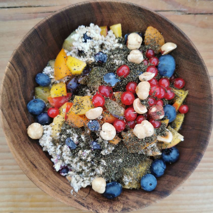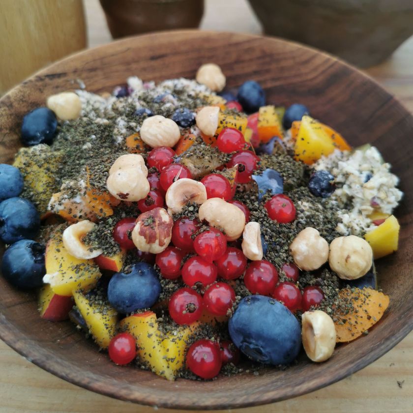 Kombinieren wir also das eingeweichte oder gar leicht fermentierte Haferflocken-Müsli mit wertvollen Samen wie Brennnessel, Leinsamen, Hanf oder Chia und toppen es mit antioxidativen Beeren und Früchten (z.B. Zwetschgen, Kirschen, Aprikosen, Pfirsiche), haben wir ein Superfood hoch drei.