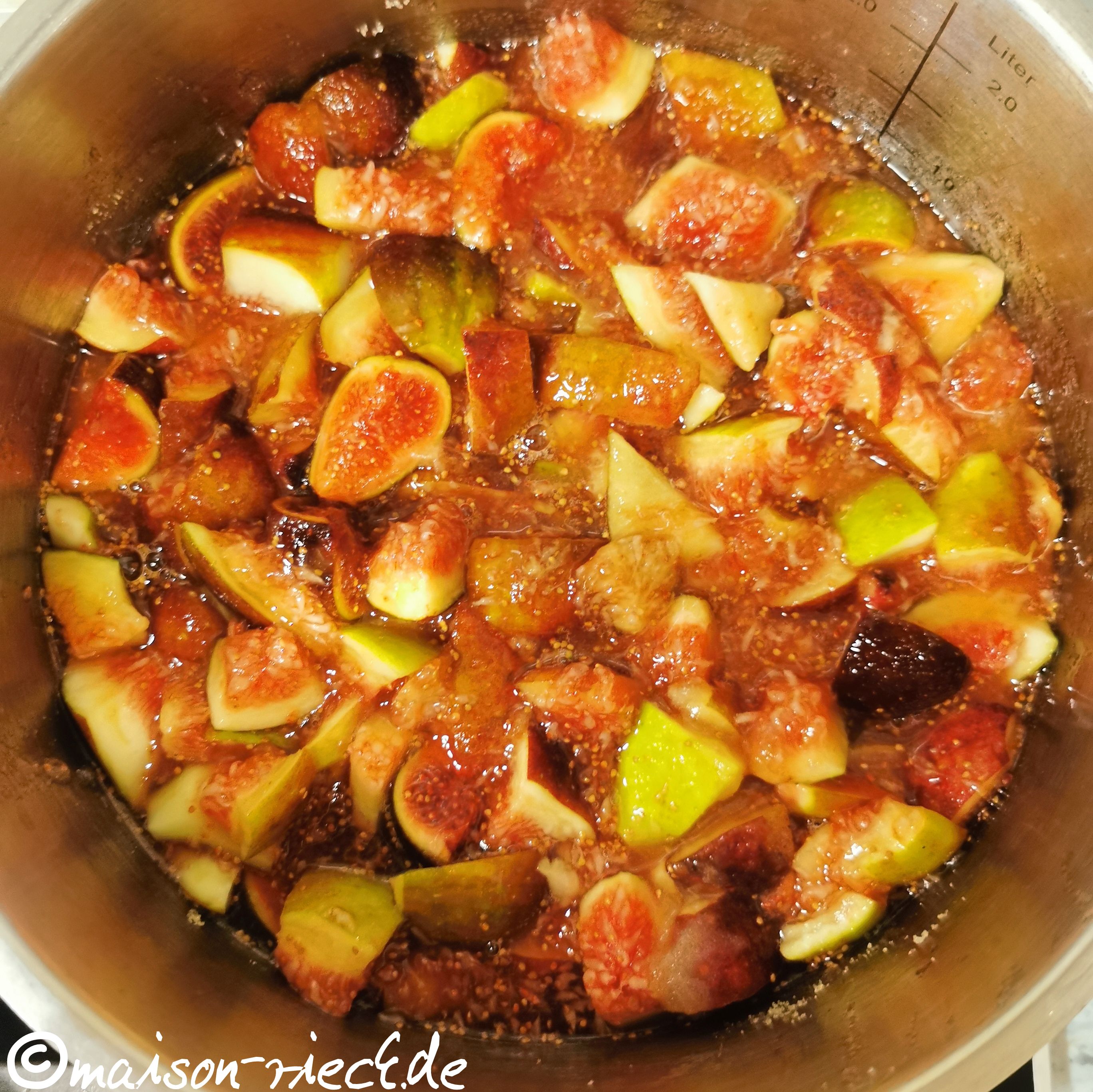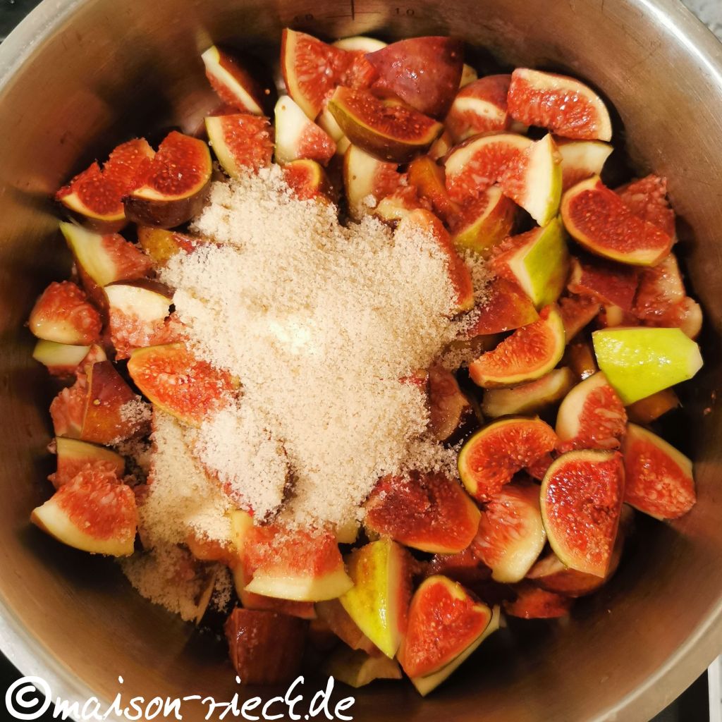 Die Feigen waschen und je nach Größe vierteln oder achteln. Die Feigenstücke zusammen mit dem Zucker in einen ausreichend großen Topf geben. Den Topf mit einem Deckel verschließen und eine Weile stehenlassen, bis der Saft aus den Feigen austritt.