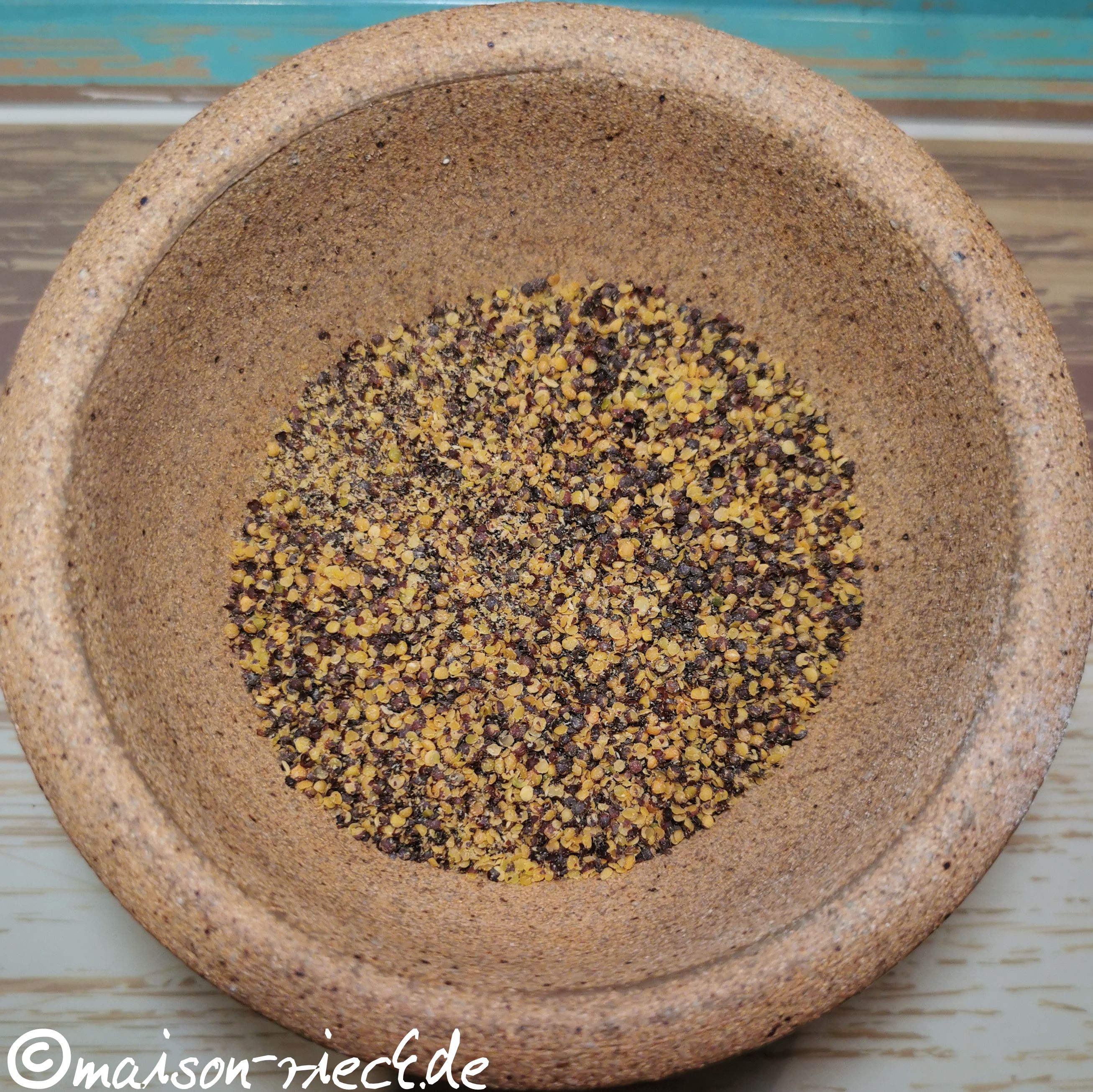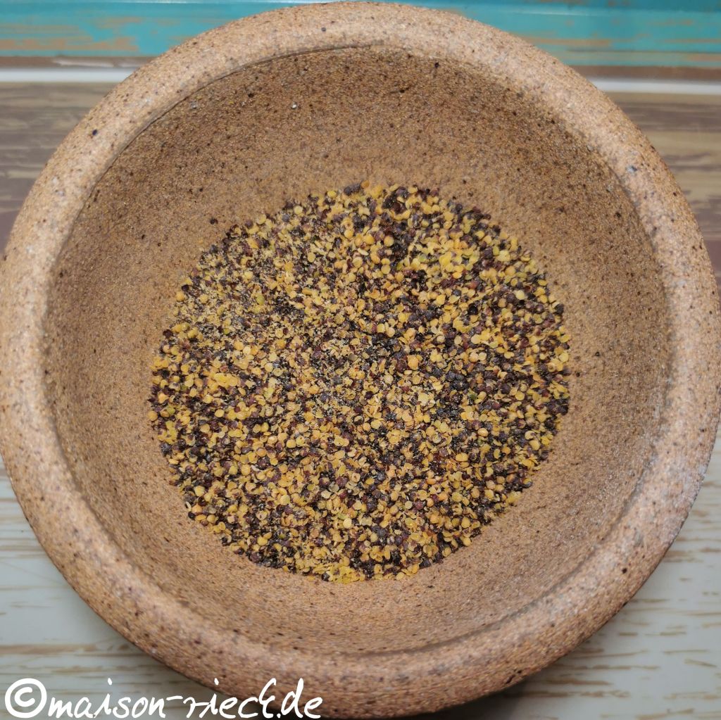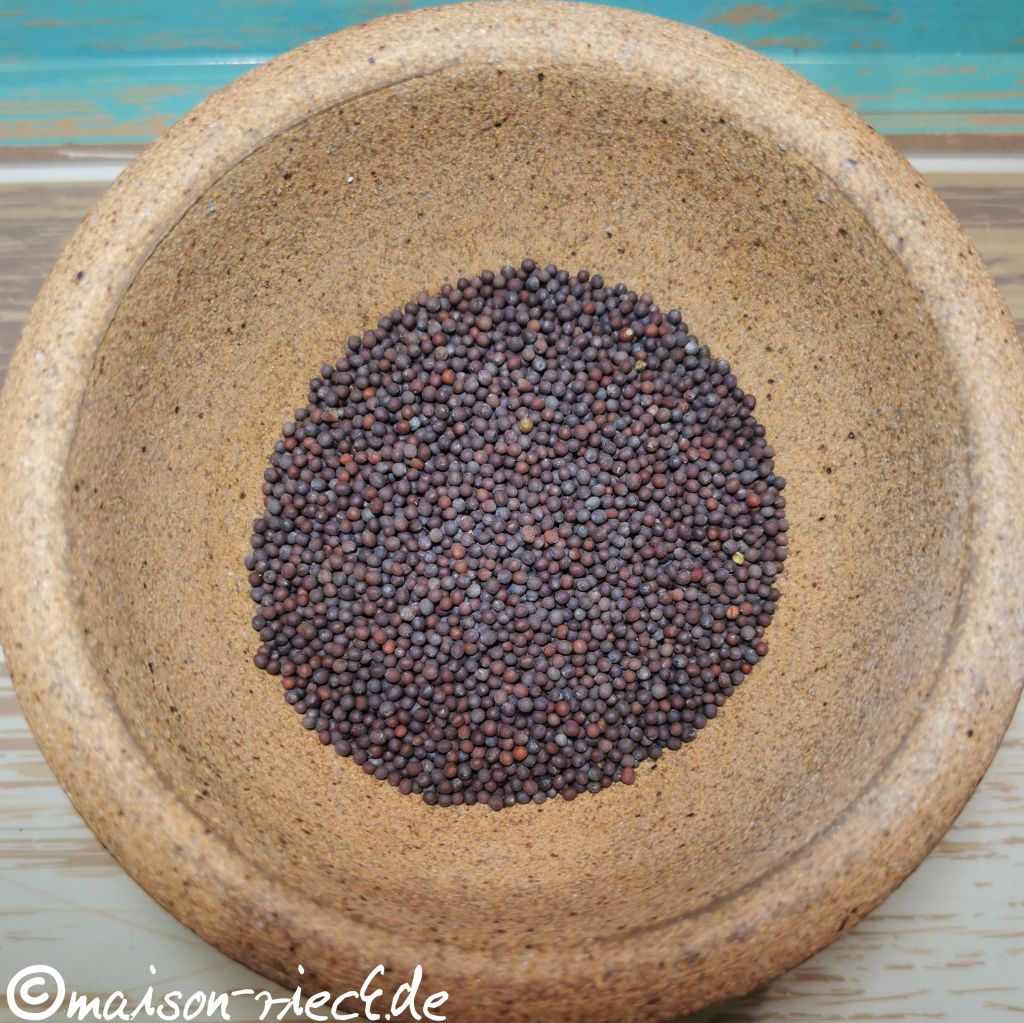 In der Zwischenzeit die Senfsaat im Mörser oder mit der Küchenmaschine grob mahlen (ein Teil kann dabei fein gemahlen sein, ein Teil grob bleiben).