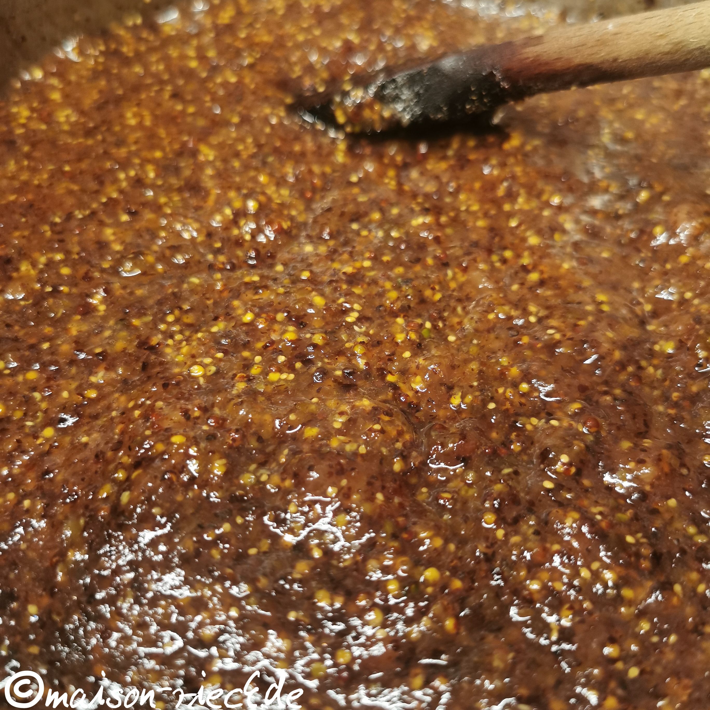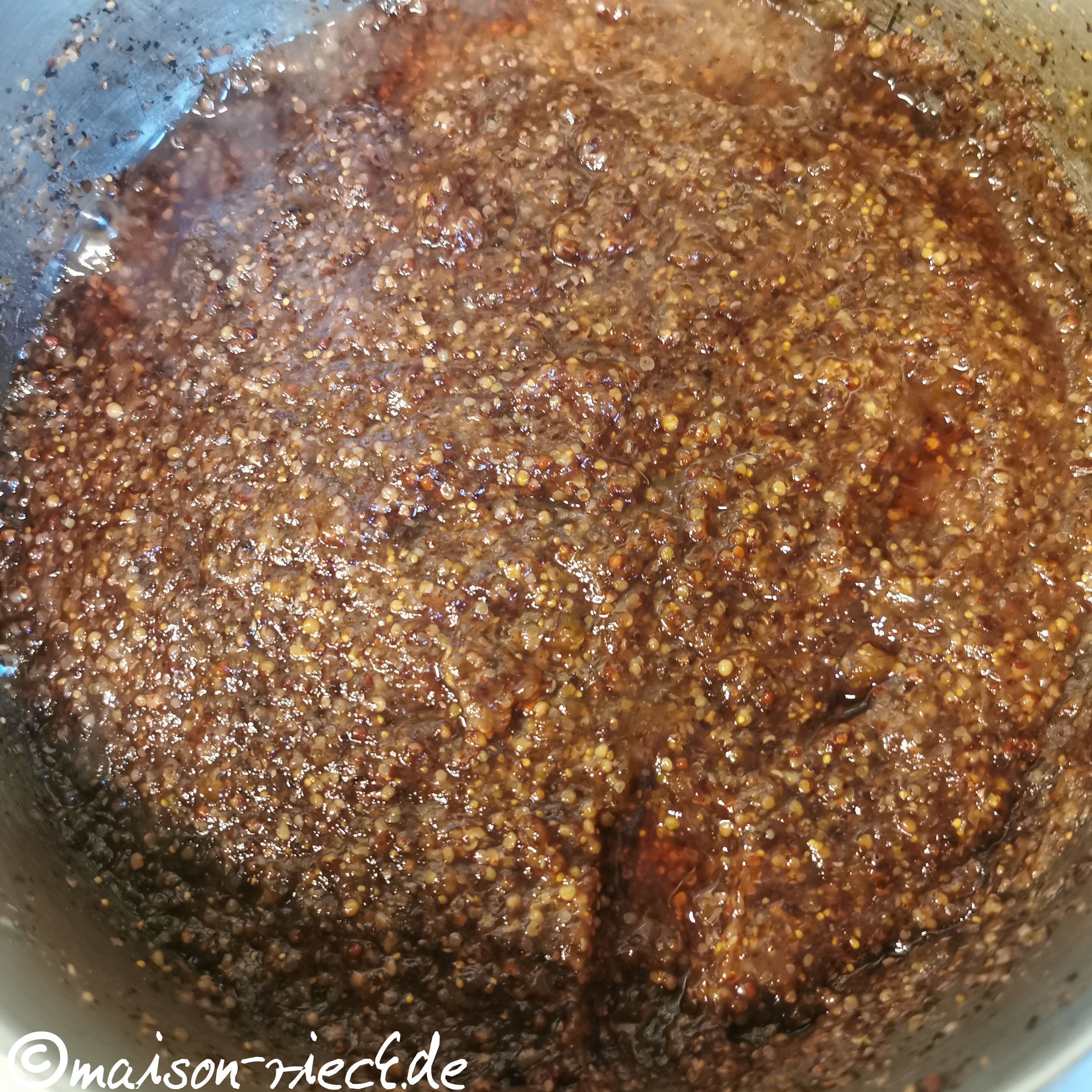 Den Essig und das Salz dazugeben und die Masse erneut kurz aufkochen. Dann die gemahlenen Senfsamen dazugeben und verrühren, bis alles gleichmäßig gemischt ist. Den Topf mit dem Deckel verschließen und abkühlen lassen.