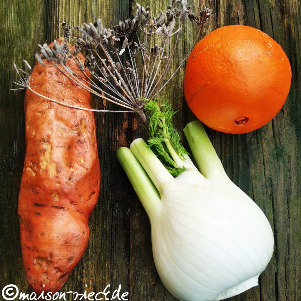 Fenchel, sowohl als Gemüse als auch in Form der getrockneten Früchte, bereichert diese Suppe, die im Winter nicht nur das Auge, sondern auch den Gaumen und die Nase erfreut. Sie lässt sich auf der Basis von Süßkartoffeln leicht zubereiten und bekommt durch die Orange eine Hauch von Sommer.