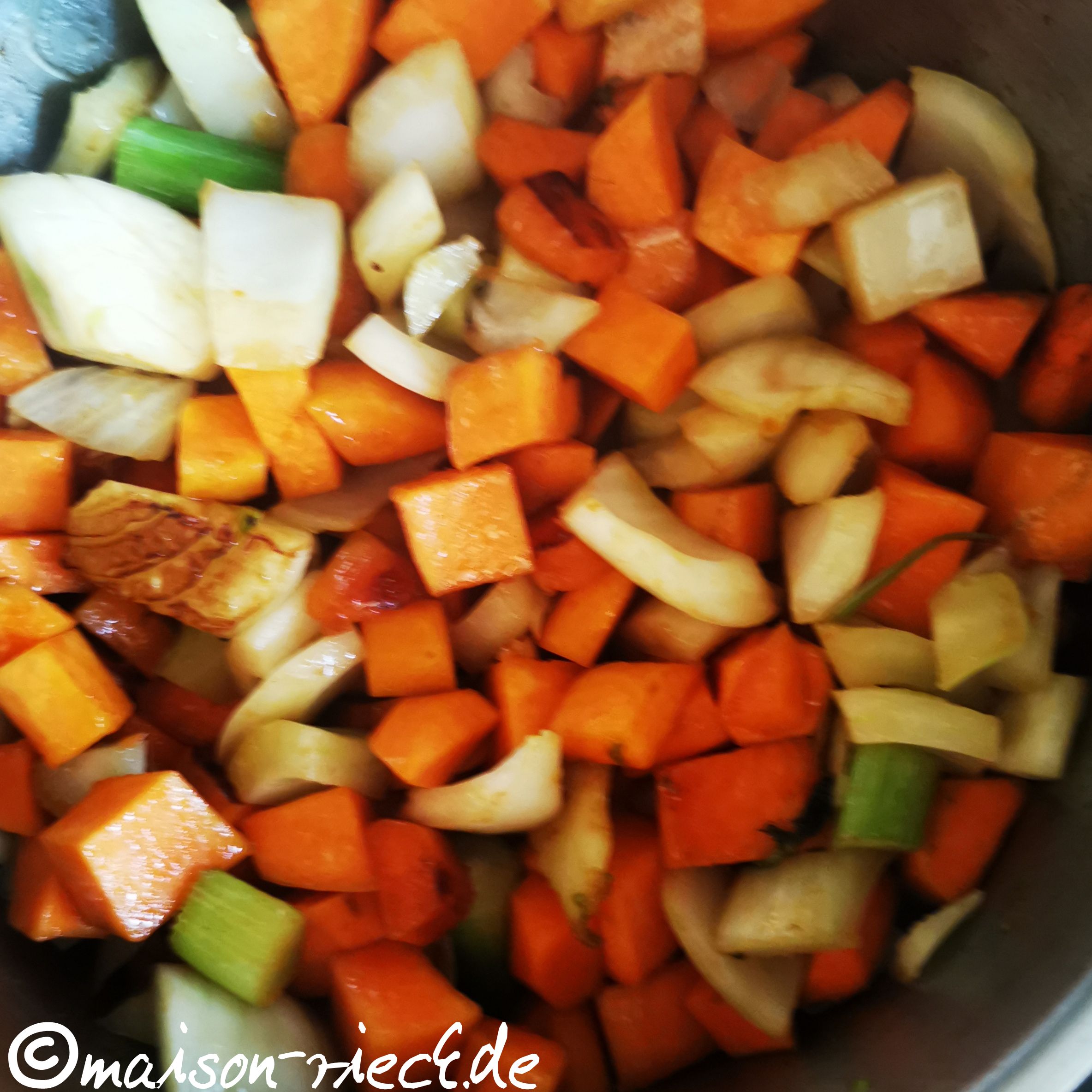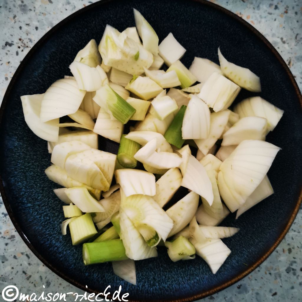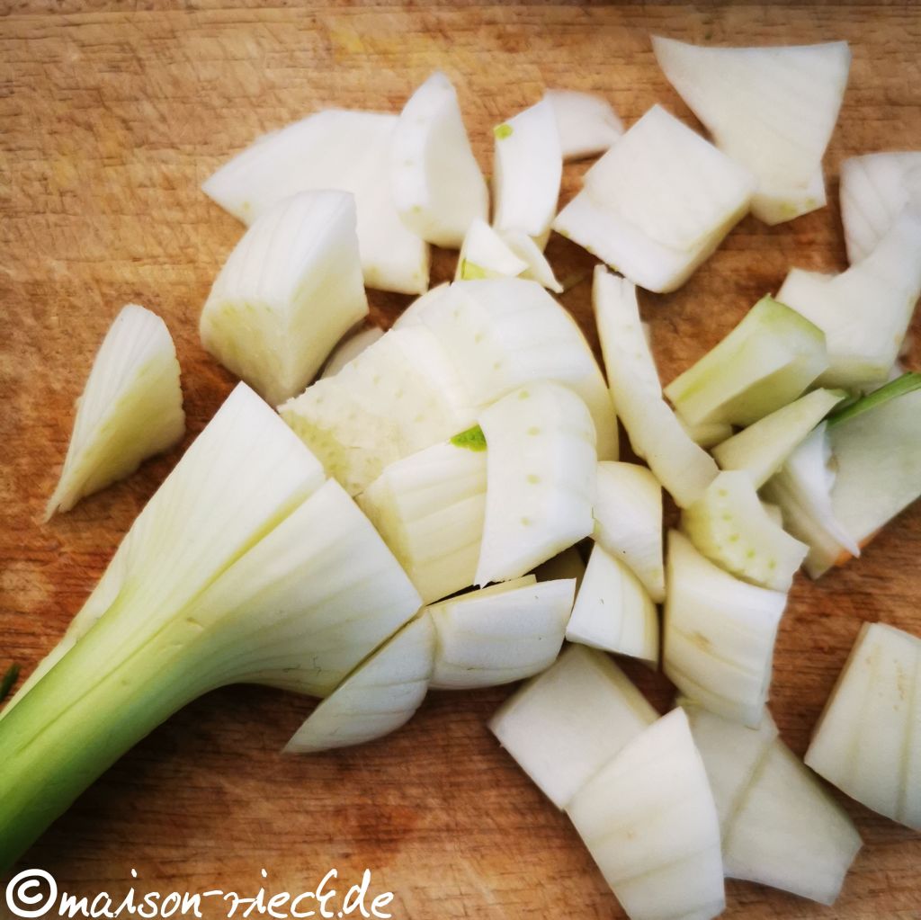 Die Süßkartoffeln mit einem Sparschäler schälen und in ca. 1 x 1 cm große Würfel schneiden. Die Fenchelknolle waschen, die feinen grünen Blätter abschneiden und die Knolle halbieren, dann erst längs in breite Streifen, dann quer in Würfel schneiden (siehe oben).