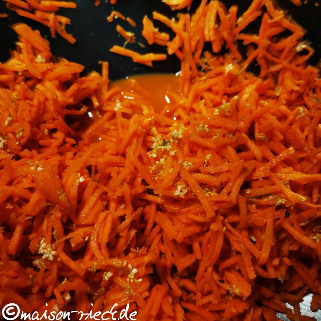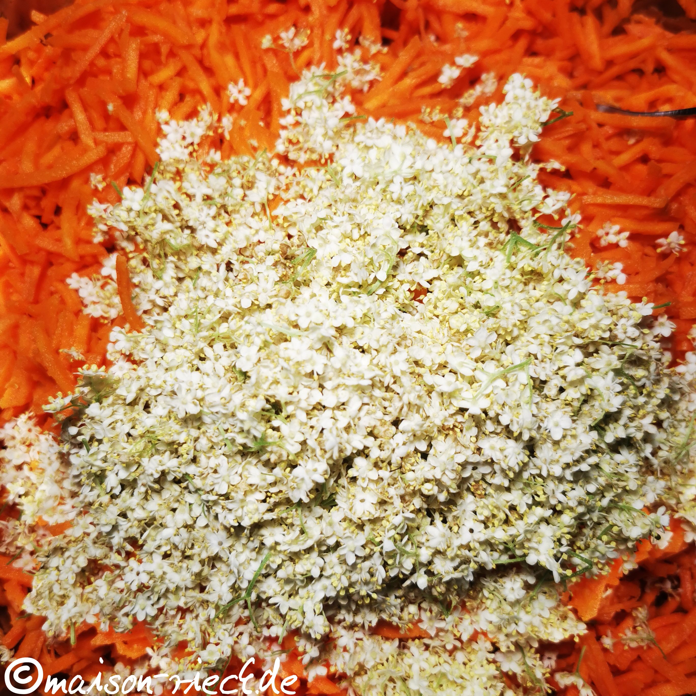 Die Möhren in feine Juliennes schneiden oder mittelfein auf einer Reibe raspeln. Die Holunderblüten von den Dolden abzupfen.