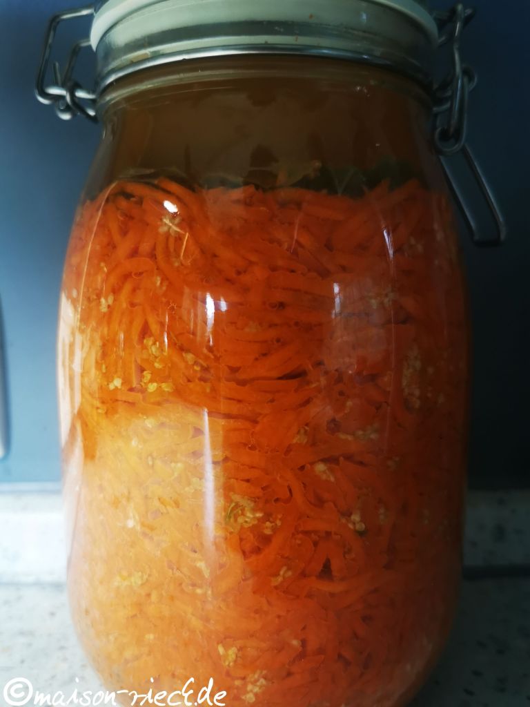 Die geriebenen oder geschnittenen Möhren werden mit 2 % ihres Gewichts an Salz gemischt, geknetet und eine Weile stehengelassen, bis sich eine Salzlake bildet. Dann wird das Gemüse in ein sauberes Drahtbügelglas gefüllt und fest hineingedrückt. Mit einem Gewicht beschwert, so dass sich alle Gemüseteile unterhalb der Lake befinden, fermentieren die Möhren für 1-2 Wochen bei Zimmertemperatur (18-22°C). Dabei muss das Gemüse immer ausreichend mit Lake bedeckt sein. Falls die entstandene Lake nicht ausreichen sollte, 2 g Salz pro 100 ml Wasser auflösen und die Lake damit auffüllen (das ist aber in der Regel nicht nötig, spätestens einen Tag nach dem Ansetzen ist normalerweise genug Lake entstanden).