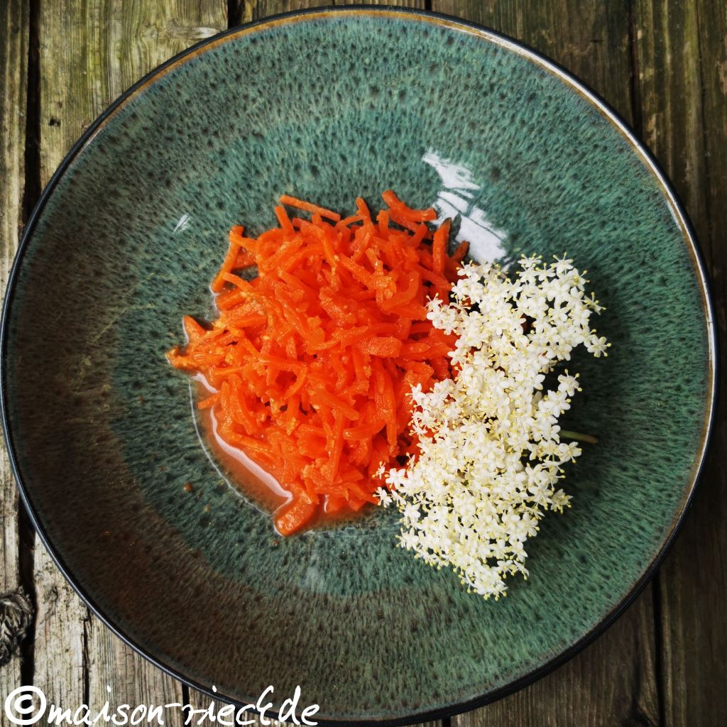 Nun kommt mit den fermentierten Holunderblüten eine salzig-säuerliche Variante dazu, die ungewohnt, aber durchaus spannend ist. Dabei werden die Holunderblüten einfach als würzende Zutat mit den geraspelten Möhren gemischt und wie einfaches Sauerkraut bzw. „Möhren“-Kraut in einem Glas fermentiert.