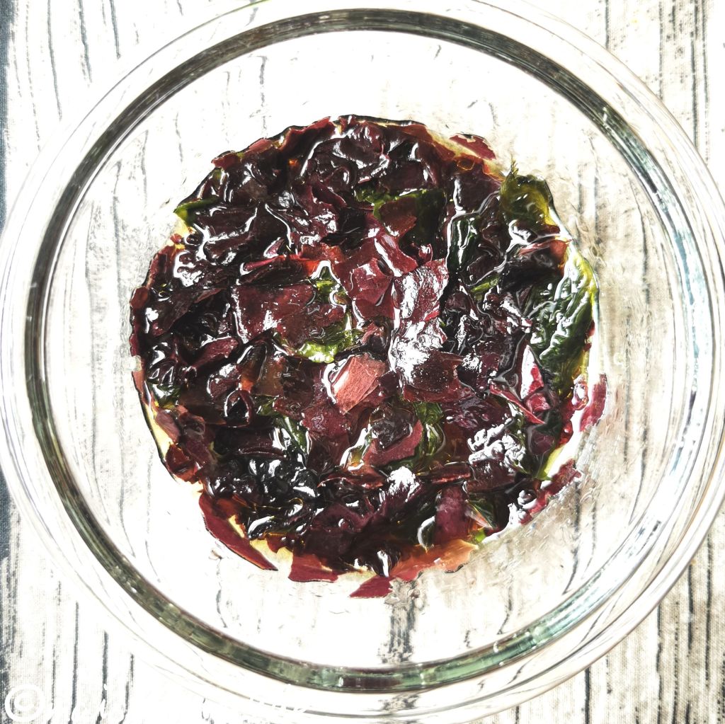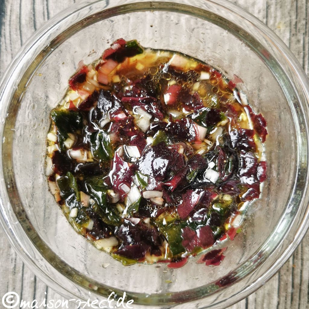 Getrocknete Algen müssen vor der Verwendung rehydriert werden, das heißt, man weicht sie für eine Weile in Wasser ein. Im nachfolgenden Rezept werden die Algen nicht nur in Wasser, sondern auch mit Zitronensaft, einer flüssigen Süße, Olivenöl und sehr fein gehackten Schalotten und Knoblauch mariniert und nehmen dadurch ein noch intensiveres Aroma an.