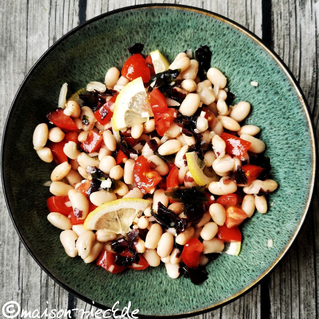Algen werden überwiegend – ähnlich wie fermentiertes Gemüse – einem Gericht nur in kleinen Mengen als gesunde und aromatisierende Zutat beigegeben. So auch in dem bretonischen Bohnensalat, der mit Meeresgemüse „veredelt“ wird und so auch ohne Fisch den frischen Geschmack des Meeres erhält.