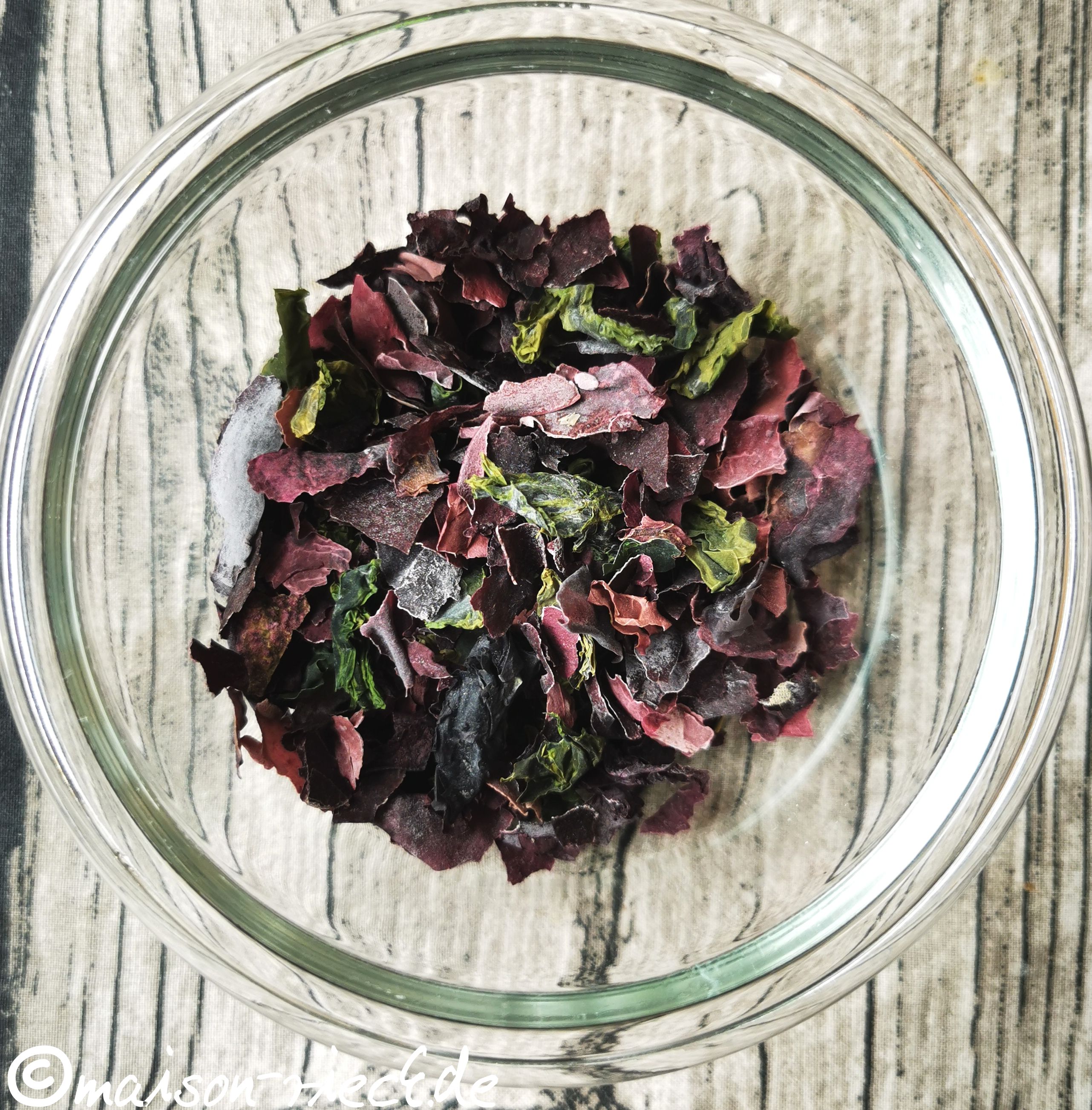 Besonders gut eignet sich eine Mischung aus je einer Grünalge (z.B. Meeressalat- Ulva lactuce), einer Rotalge (z.B. Dulse- Palmaria palmata) und Braunalge (z.B. Wakame – Undaria pinnatifida), die auch „Fischersalat“ (Salade de Pêcheur) genannt wird.