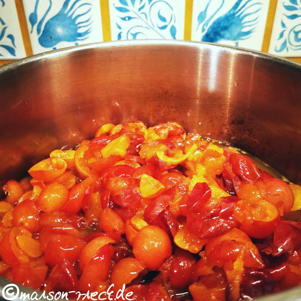 Die Zubereitung ist nicht schwieriger als die Herstellung eines Kompotts oder einer Konfitüre, sie dauert nur etwas länger. Dabei karamellisiert ein Teil des Fruchtzuckers, was zusätzliche Aromen mit sich bringt.