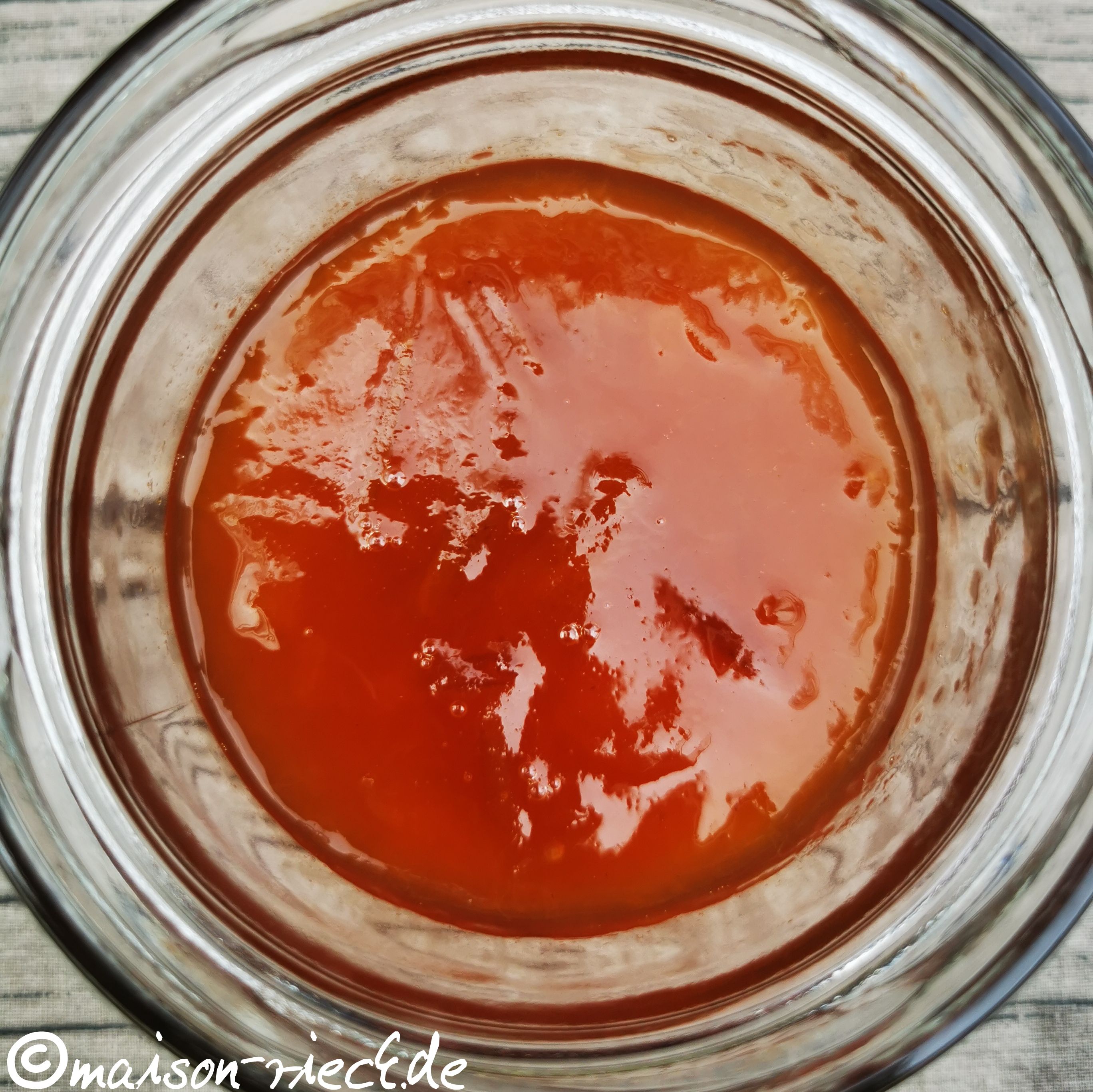 Und nun zum Vergleich: man kann aus Kriecherln natürlich auch Konfitüre herstellen, also einen Fruchtaufstrich, der die ganze Frucht bzw. ein daraus hergestelltes Fruchtmus enthält. Um diese sehr flüssige Zubereitung haltbar zu machen, braucht es zum einen (viel) Zucker und darüber hinaus noch eine Substanz, die dafür sorgt, dass die fertige Konfitüre streichfähig ist, also nicht vom Butterbrot fließt. Das wird in der Regel mit Pektin erreicht. Weniger bekannt ist, dass darüber hinaus auch oft noch Öl oder Fett enthalten ist, das die Bildung von Schaum beim Kochen verhindert. Verwendet man Gelierzucker mit einem geringeren Zuckeranteil, beispielsweise 2:1 oder 3:1, ist außerdem meist noch ein Konservierungsmittel enthalten (z.B. Kaliumsorbat), da ansonsten die Haltbarkeit nicht gewährleistet ist. Zusätzlich ist ein Säuerungsmittel, in der Regel Citronensäure (eine zwar natürlich in vielen Früchten vorkommende Substanz, industriell allerdings überwiegend aus Schimmelpilzen hergestellte Säure, die ähnlich wie Zitronensäure schmeckt), zugesetzt. Dies ist notwendig, um die Süße, die durch den zugesetzten Zucker entsteht, wieder auszubalancieren. Ansonsten würde ein Fruchtaufstrich einfach nur süß schmecken.