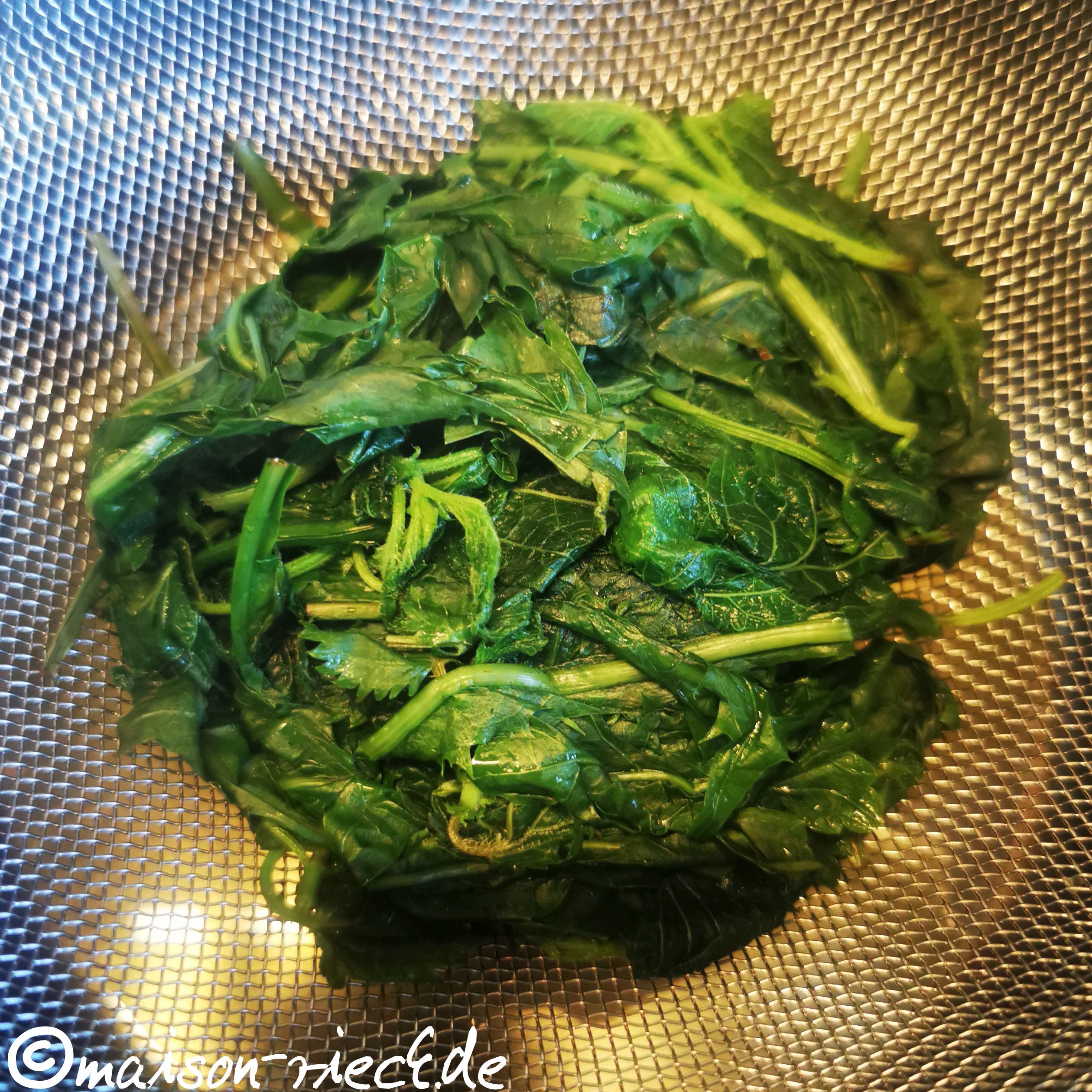 Die Wildkräuter (oder den Spinat bzw. eine Mischung aus beidem) waschen und abtropfen lassen. Einen Topf mit ca. 1 cm Wasser füllen, dieses zum Kochen bringen. Den (Wild-)Spinat hineingeben, den Deckel schließen und das Gemüse ca. 2-3 Minuten kochen lassen, bis es zusammengefallen ist. Dann in ein Sieb geben und über einer Schüssel abtropfen lassen (das Kochwasser aufbewahren)