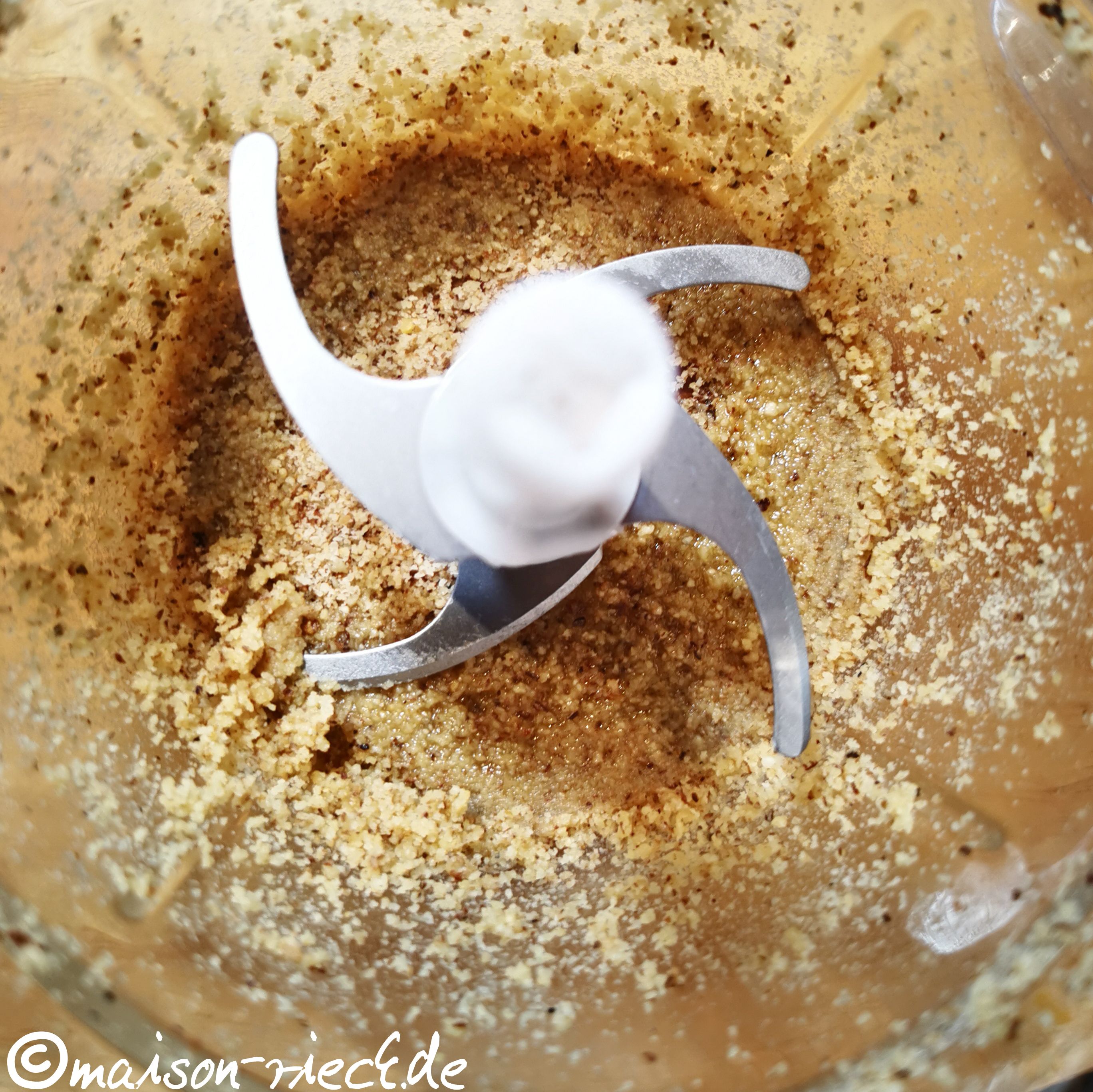 Die Walnüsse in einer Pfanne ohne Öl bei mittlerer Hitze anrösten, bis sie leicht Farbe annehmen, dann etwas abkühlen lassen und in einem kleinen Pürierbecher geben und fein zerkleinern, möglichst bis die Nüsse eine cremige Konsistenz bekommen. Ggf. etwas Walnussöl oder neutrales Speiseöl zufügen.
