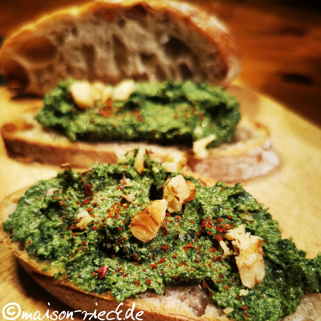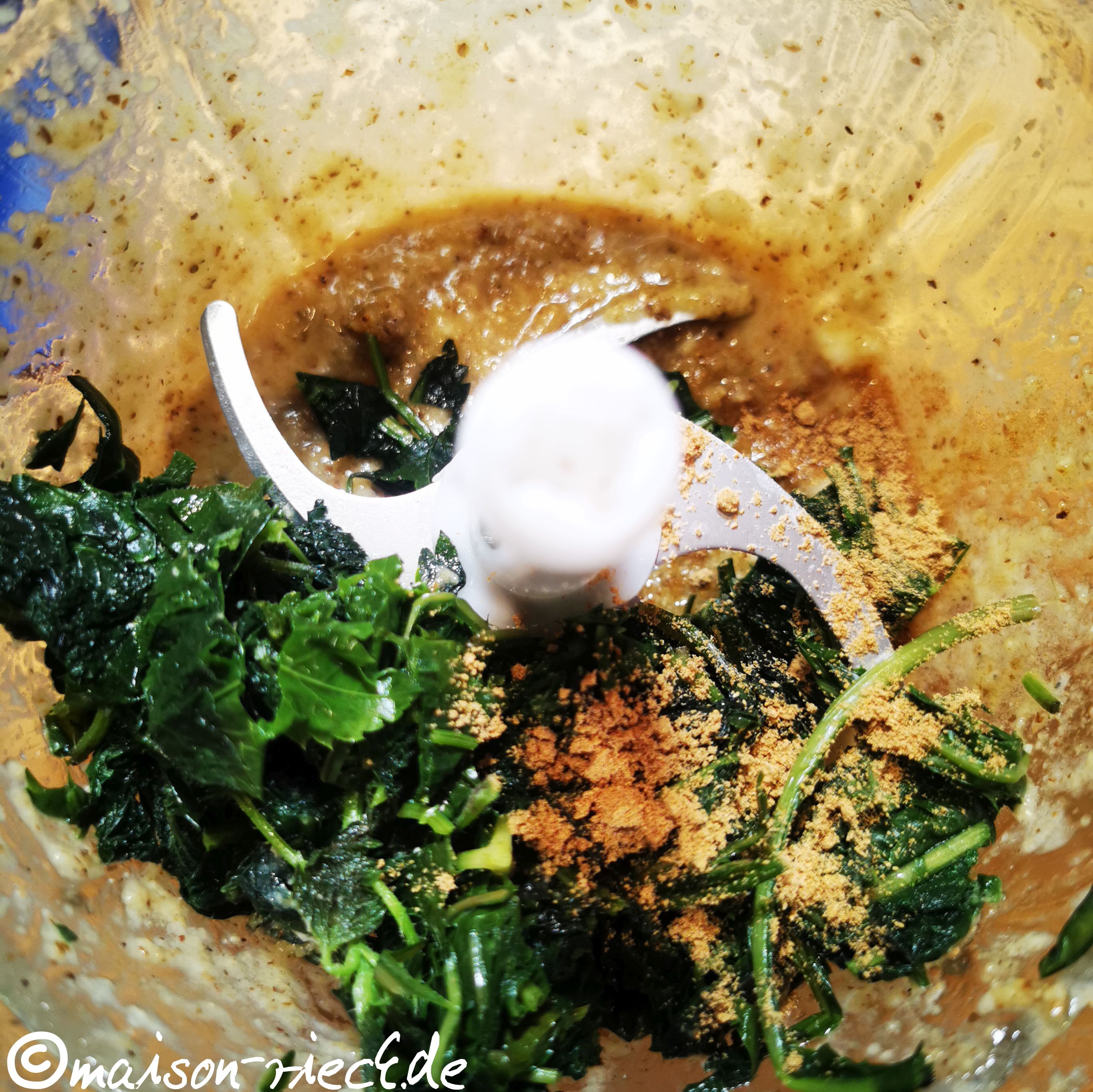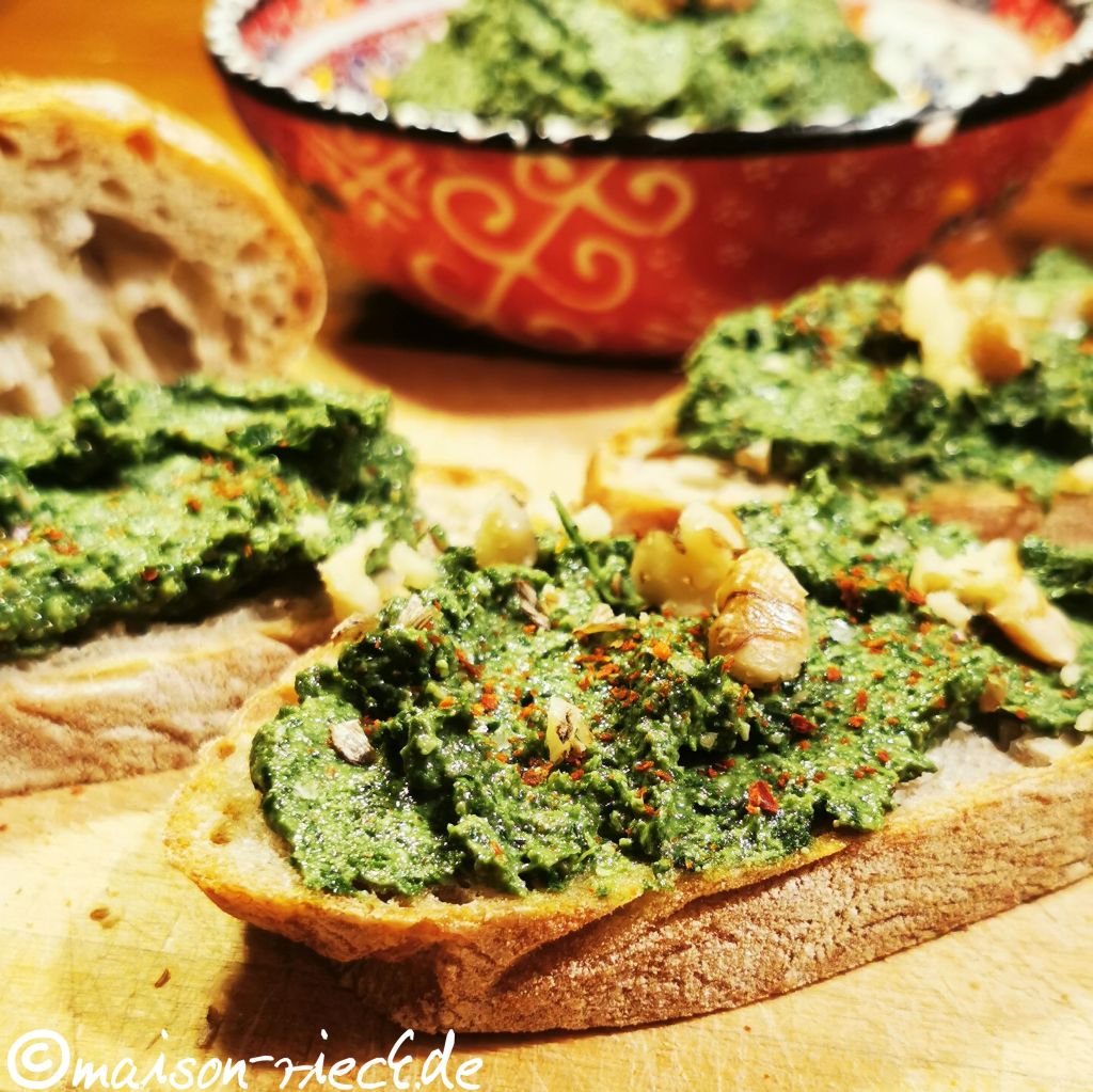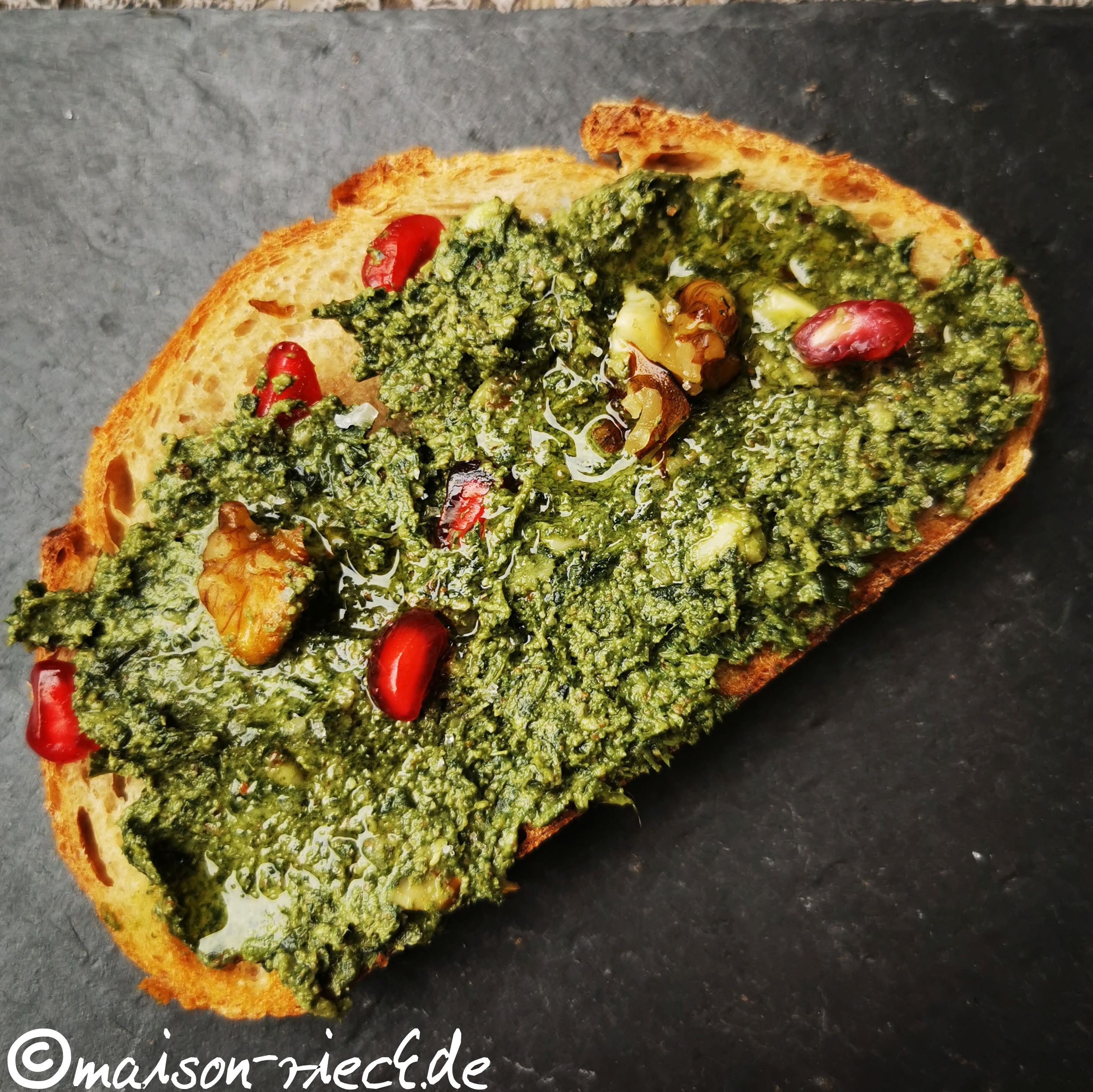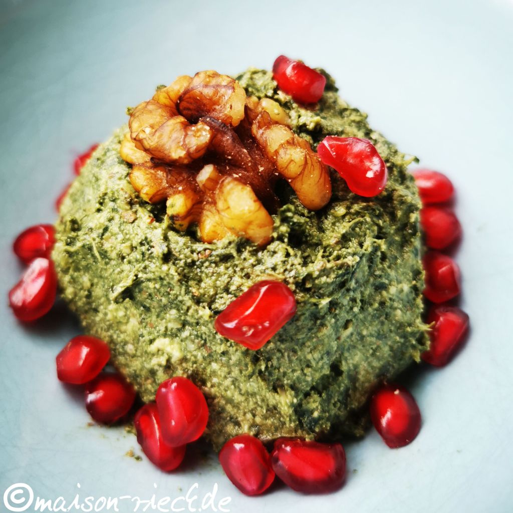 Knoblauch, Koriandersamen Salz und Pfeffer zum Walnussmus geben und kurz pürieren. Dann den gekochten (Wild-)spinat bzw. die Wildkräuter dazugeben und erneut kurz zerkleinern. Den Granatapfelsirup oder Apfelessig dazu geben, alles nochmals ganz kurz pürieren. Je nach Konsistenz ggf. noch ein wenig Wasser dazugeben. Mit Salz und frisch gemahlenem schwarzen Pfeffer abschmecken.