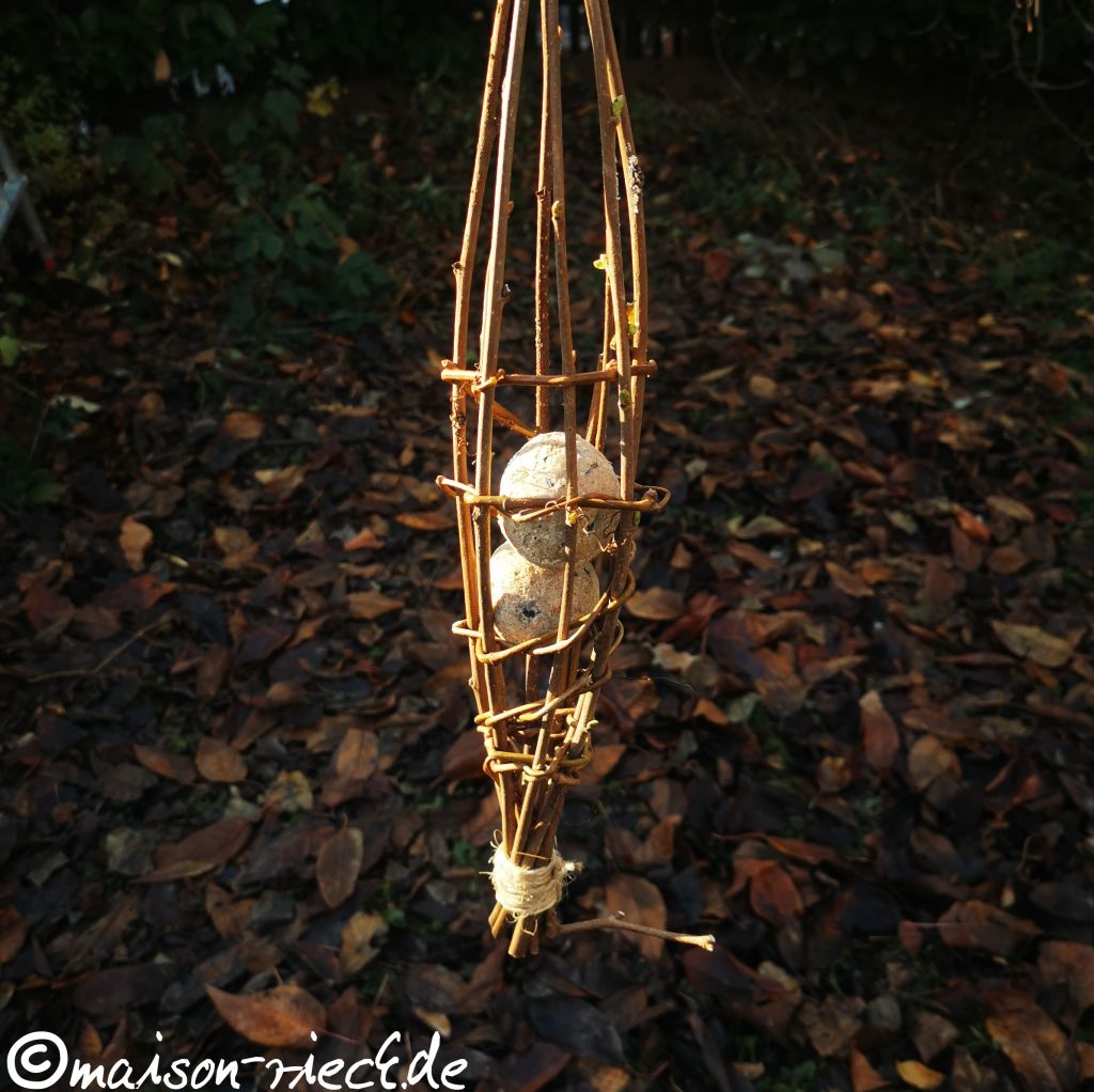 Aus dem Rückschnitt von Sträuchern und Rankpflanzen lässt sich im Handumdrehen eine Futterstation flechten, in der Meisenknödel gut aufgehoben sind und an der die kleinen Flugakrobaten guten Halt beim Fressen finden.